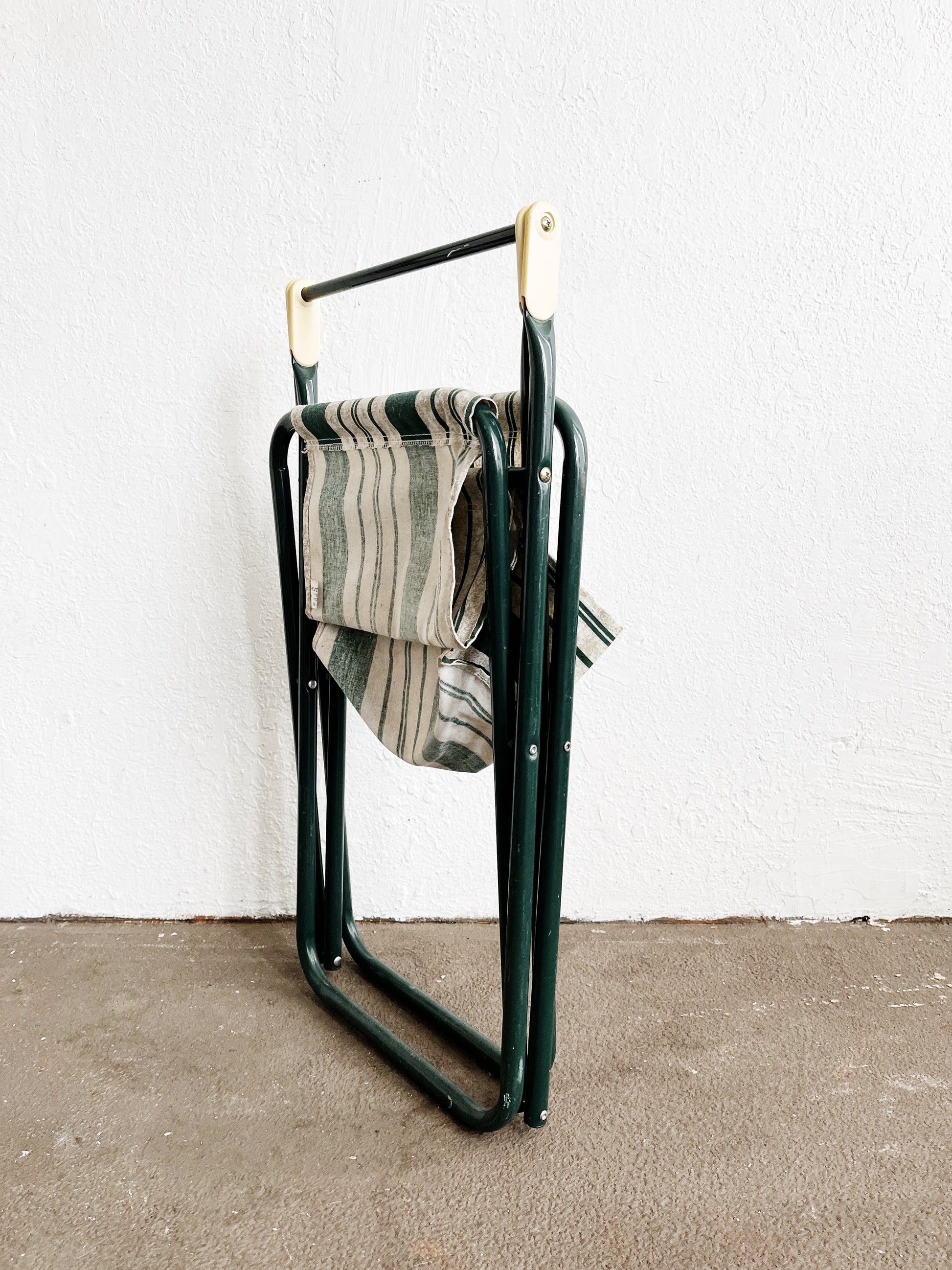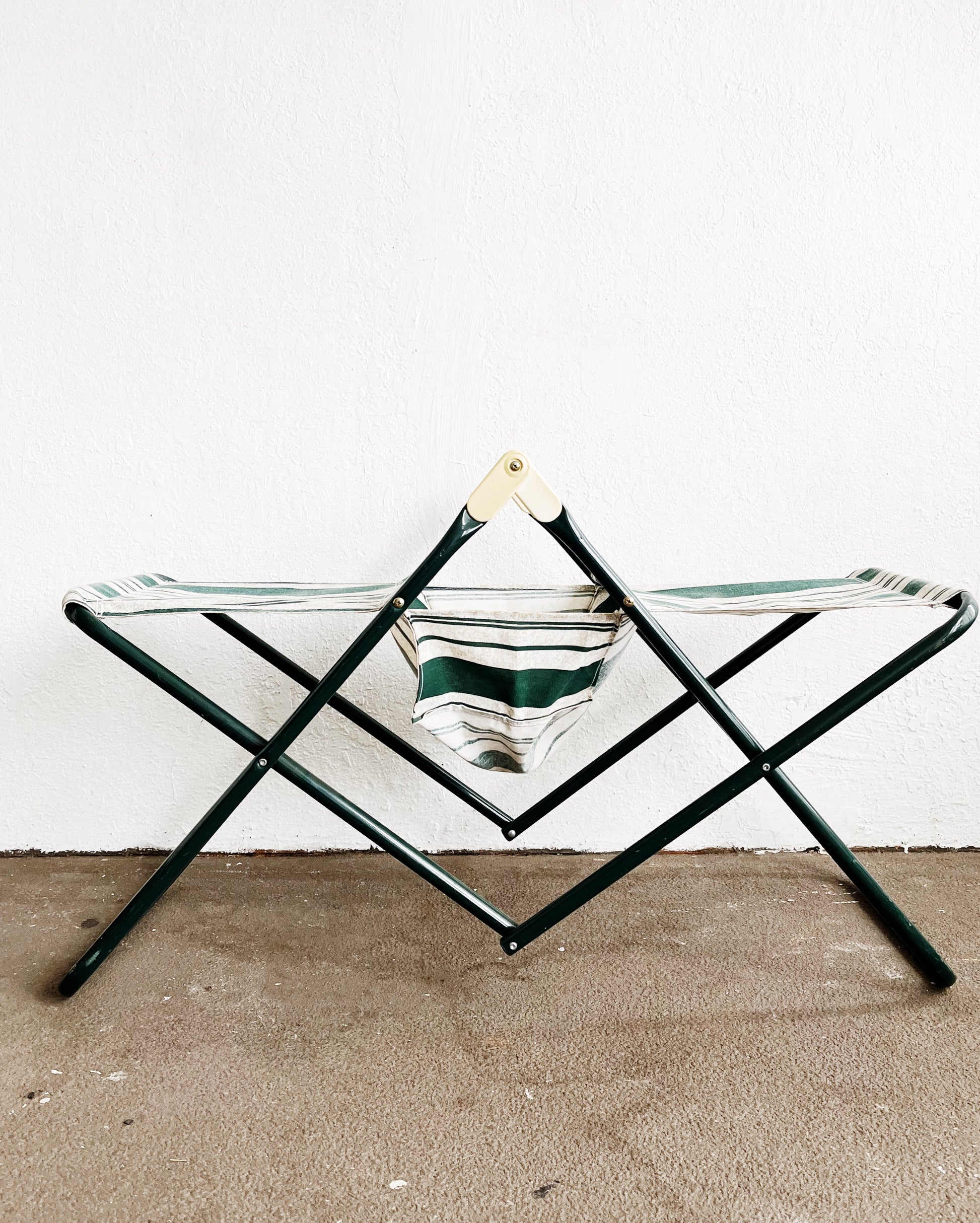 Vintage double seater camp bench with pouch in between. Folding metal frame that collapses easily from simply picking it up by the handle. Great for littles to share but works for grownups too