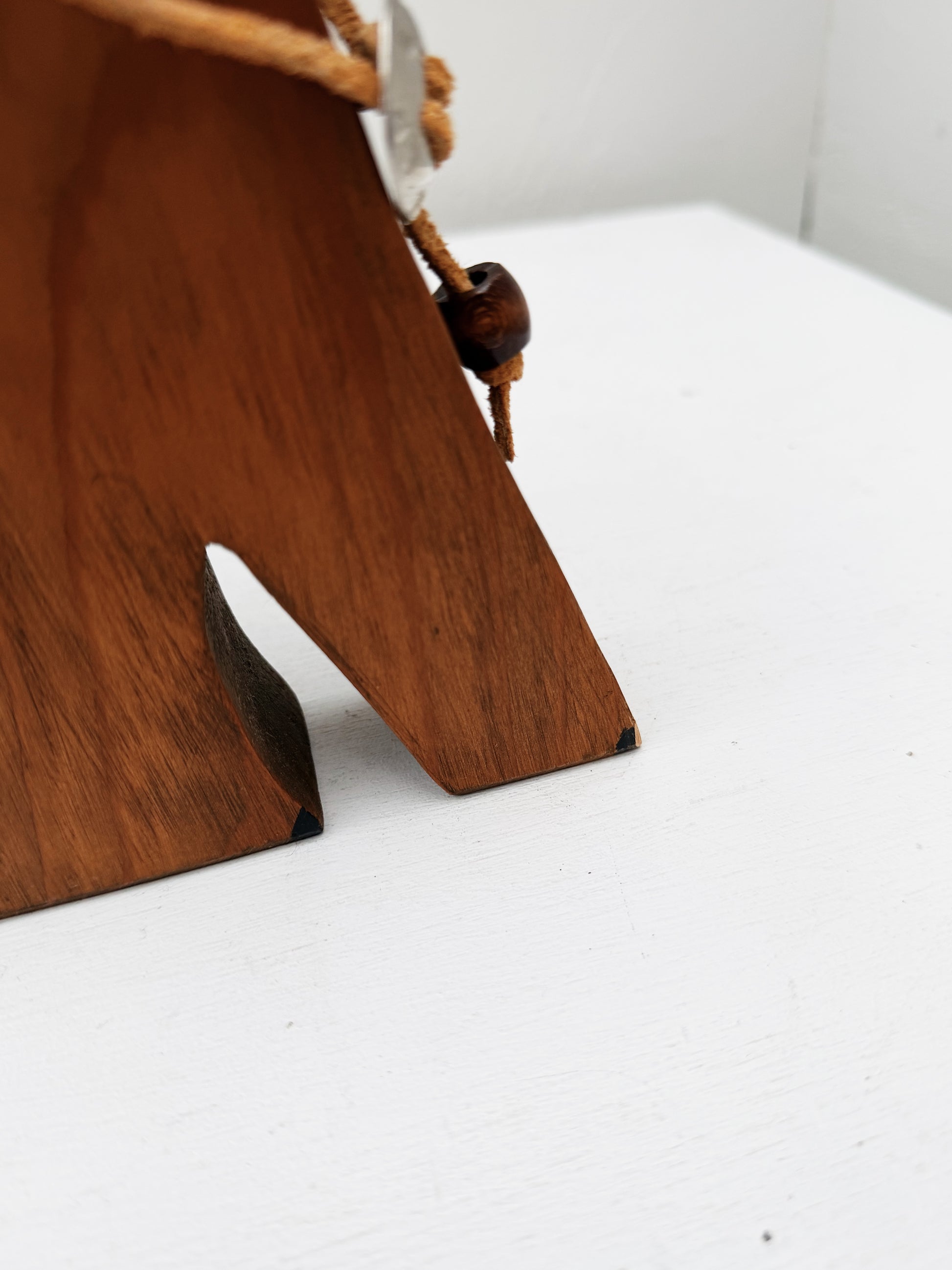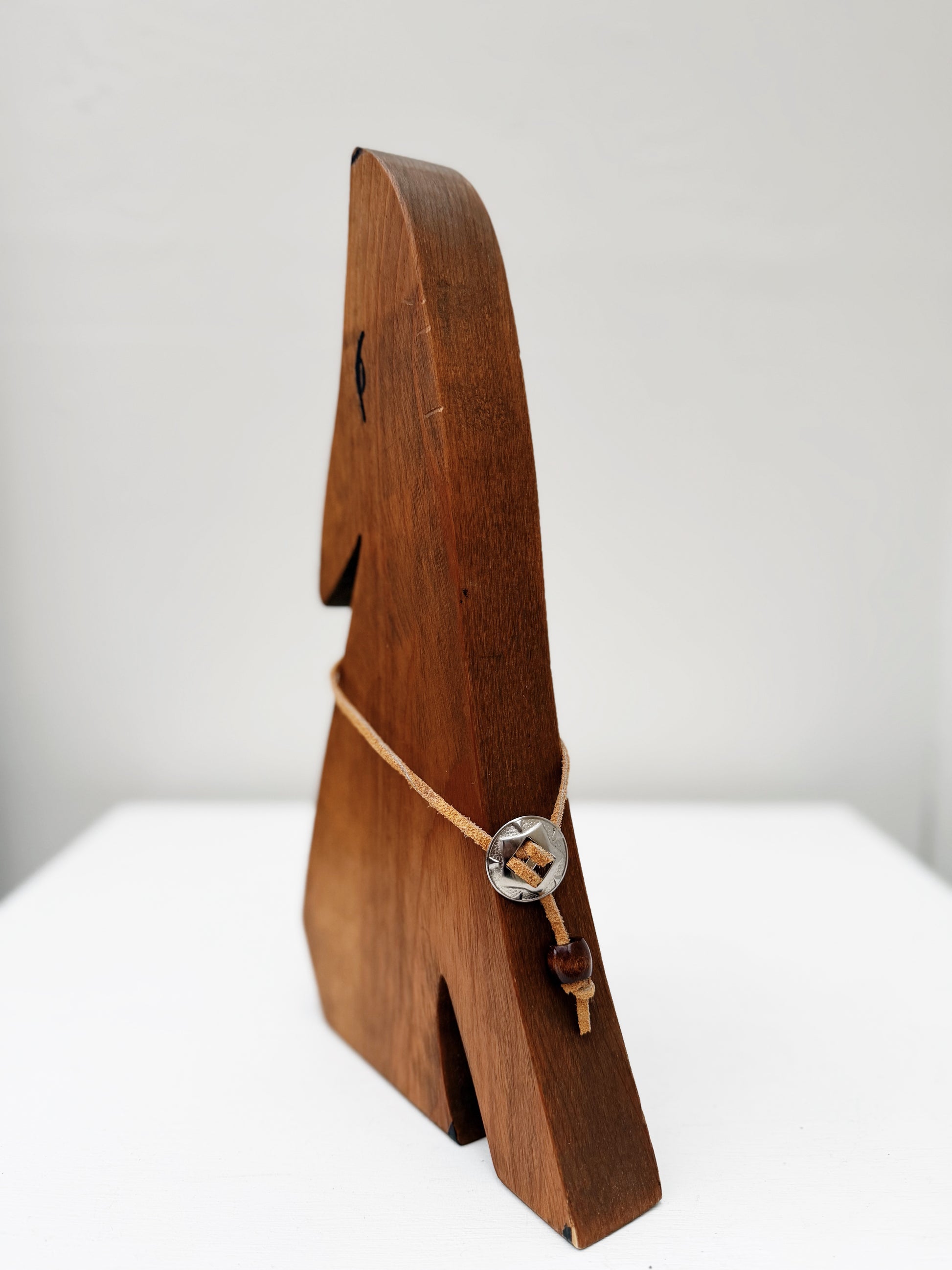Charming lil guy, yipping at the moon. Made of wood with a removable lariat