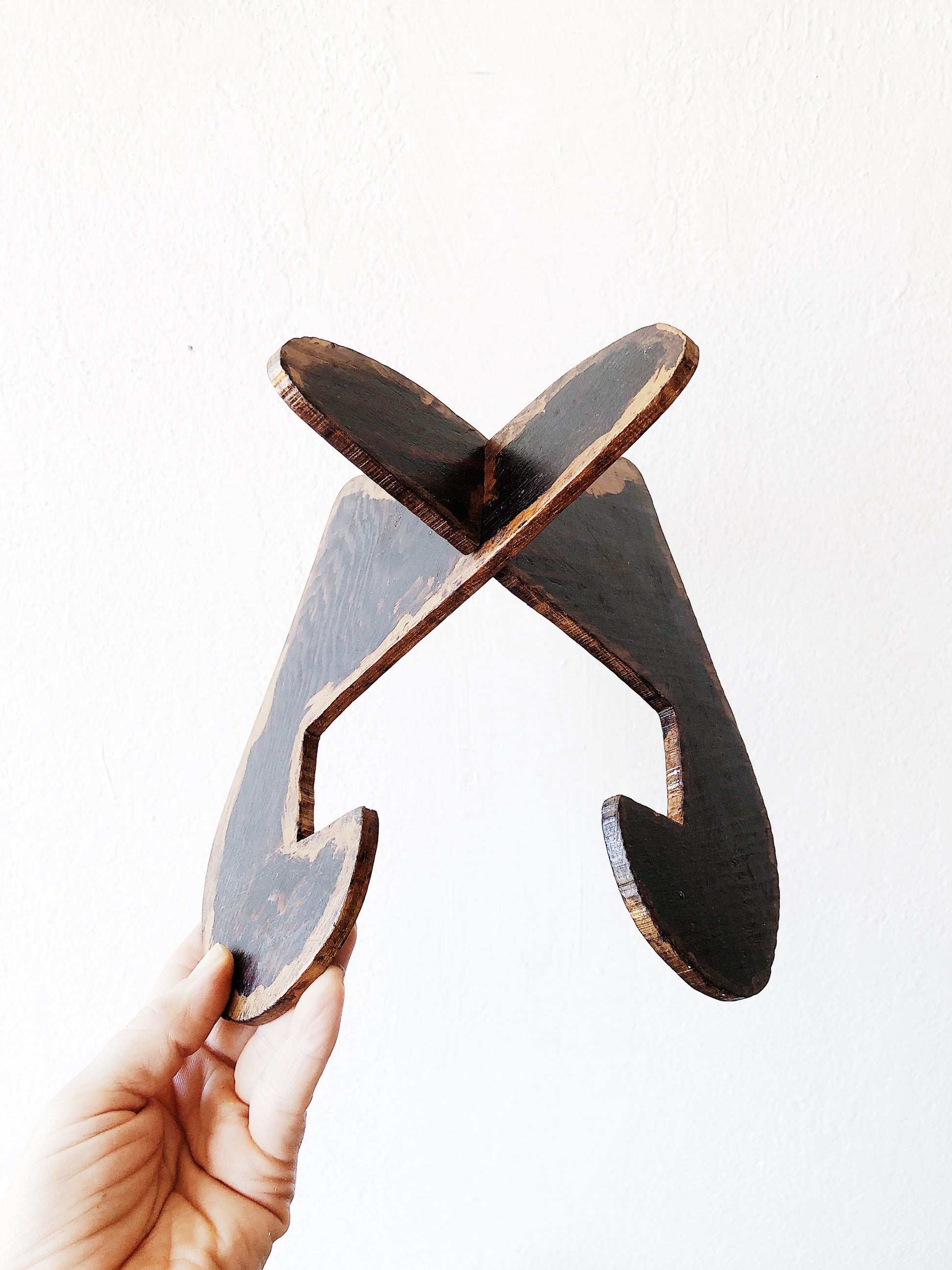 A unique table top easel for a treasured piece of artwork. Made of painted wood in the folk style. Comes apart. Works best with frames 9x12 or smaller