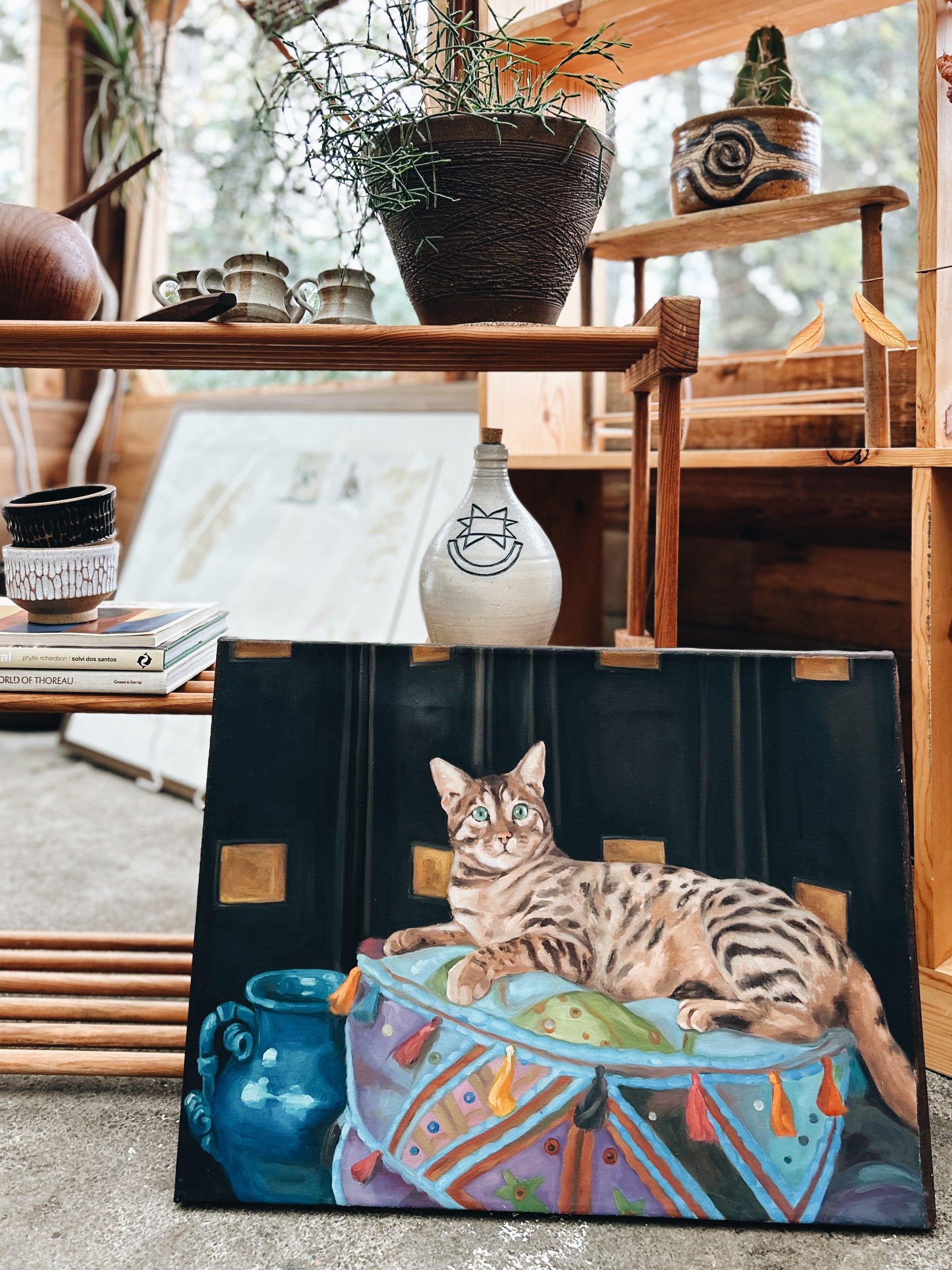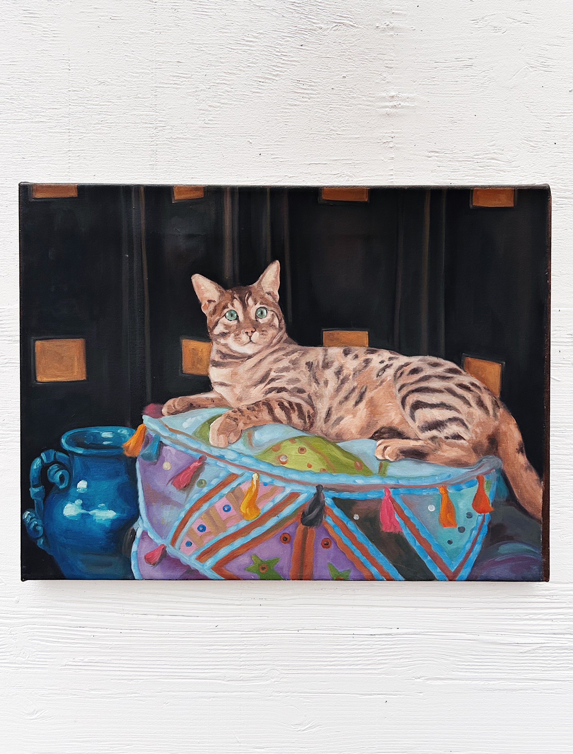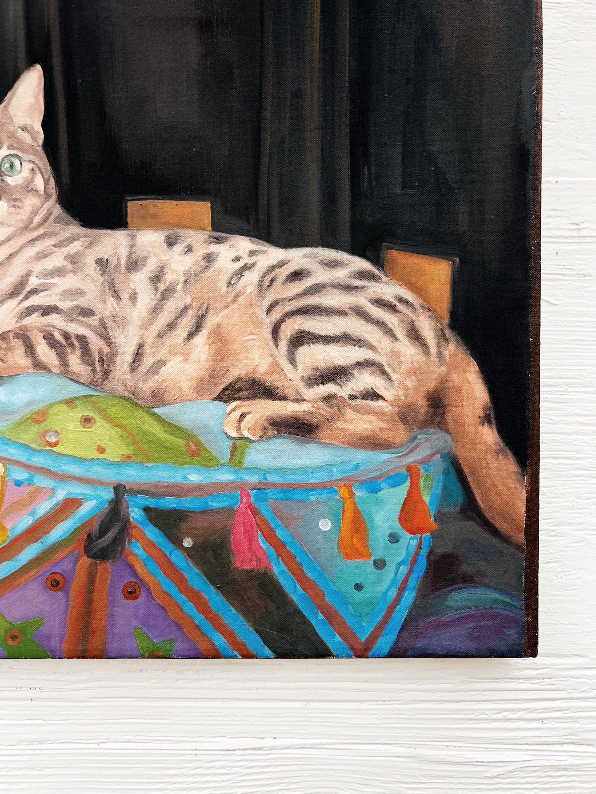 Regal spoiled kitty on its special tuffet. Warmly painted with expressive face. Classic whimsical folk art on linen and a hard edged board.