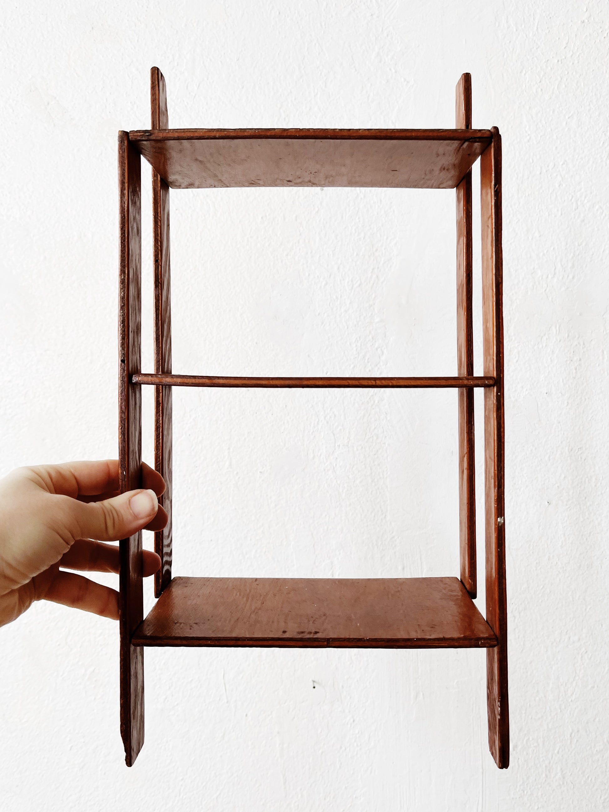 Nice little handmade shelf with a unique construction. Age related wear but nothing that detracts