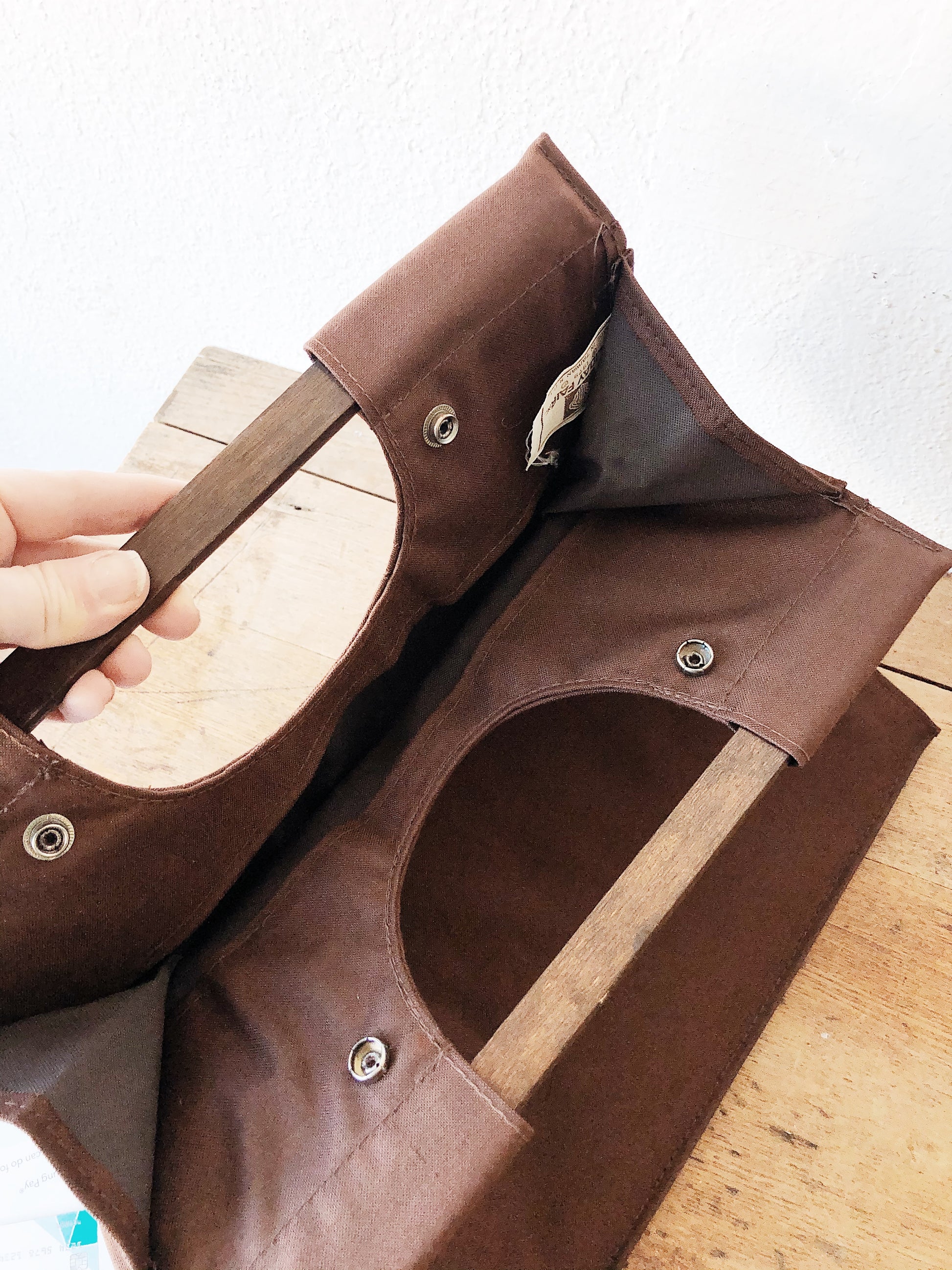 Ah the 70s....classic canvas tote with wooden handle.