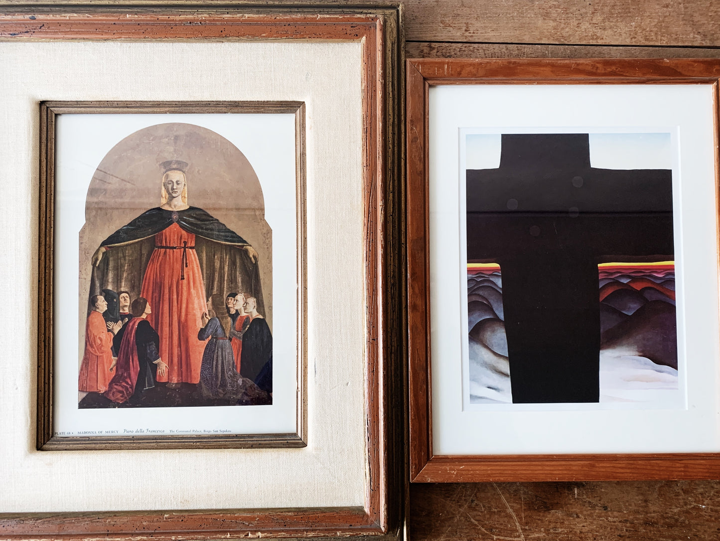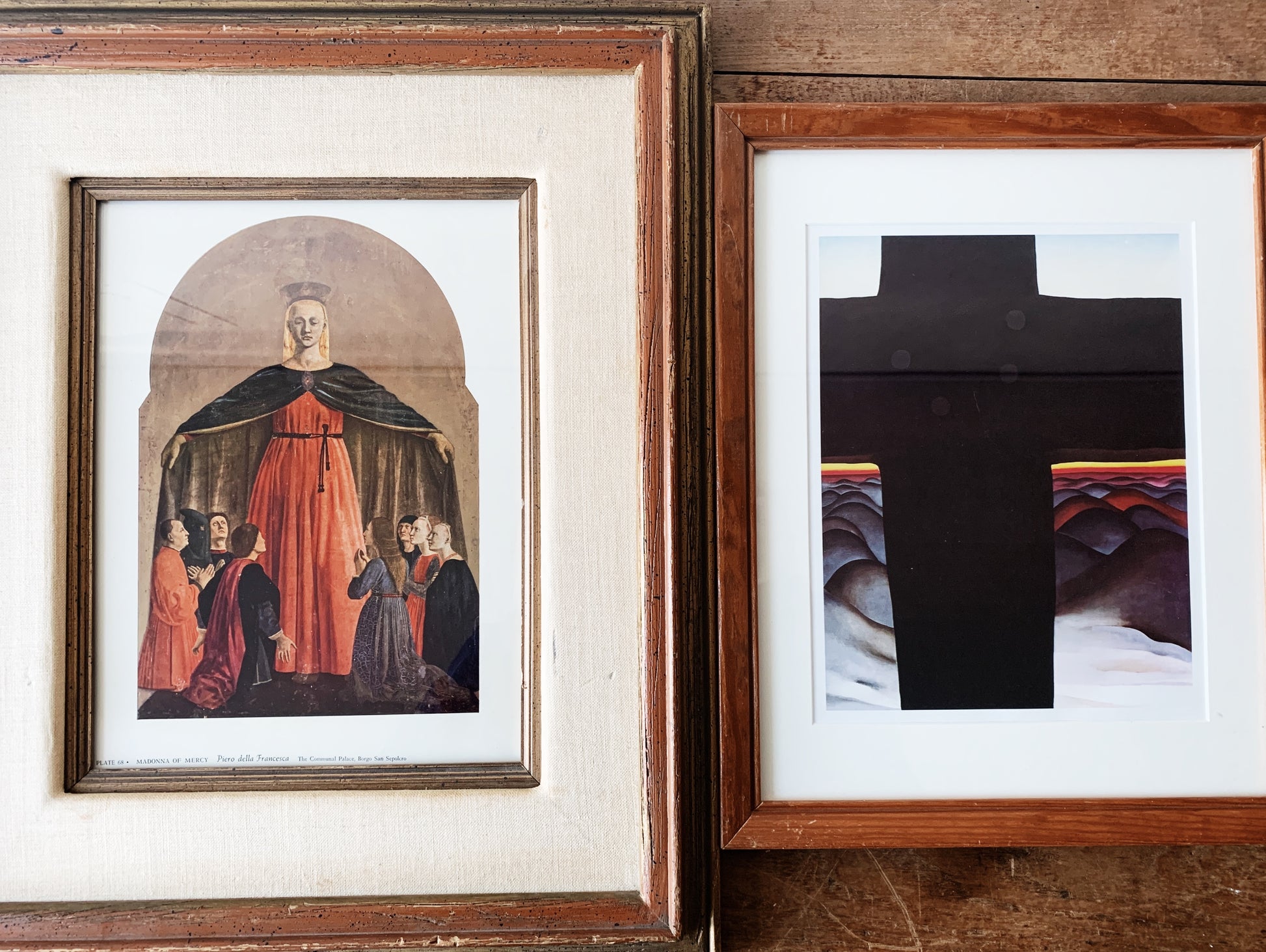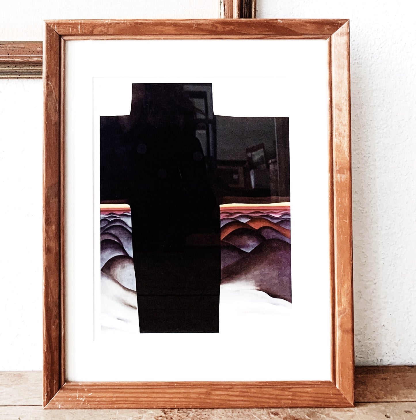 Georgia O’Keeffe’s Black cross matted and framed in vintage wood under glass. 12x15”