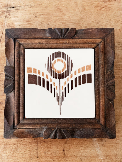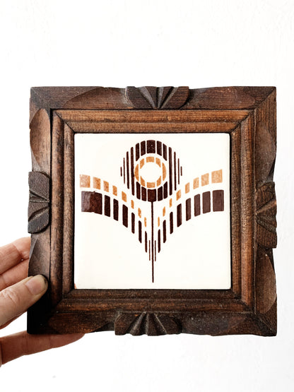 Wonderful graphic on this 70’s art tile. Set in decorative carved wood.