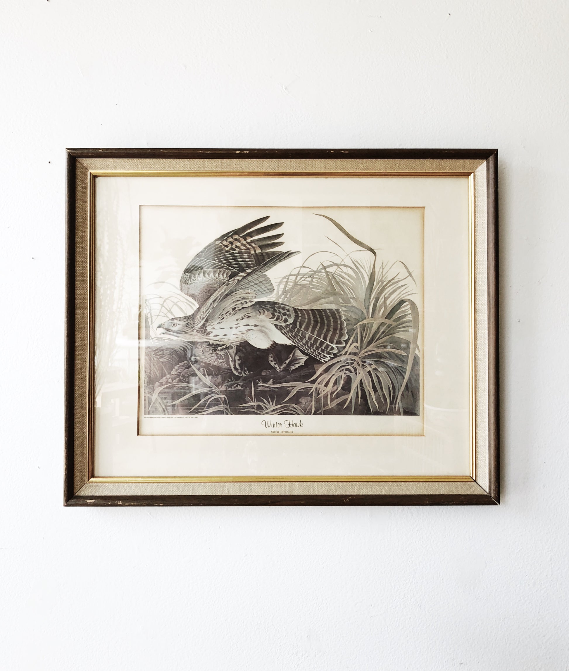 1940s Audubon lithograph ‘Winter Hawk’. Pretty linen frame
