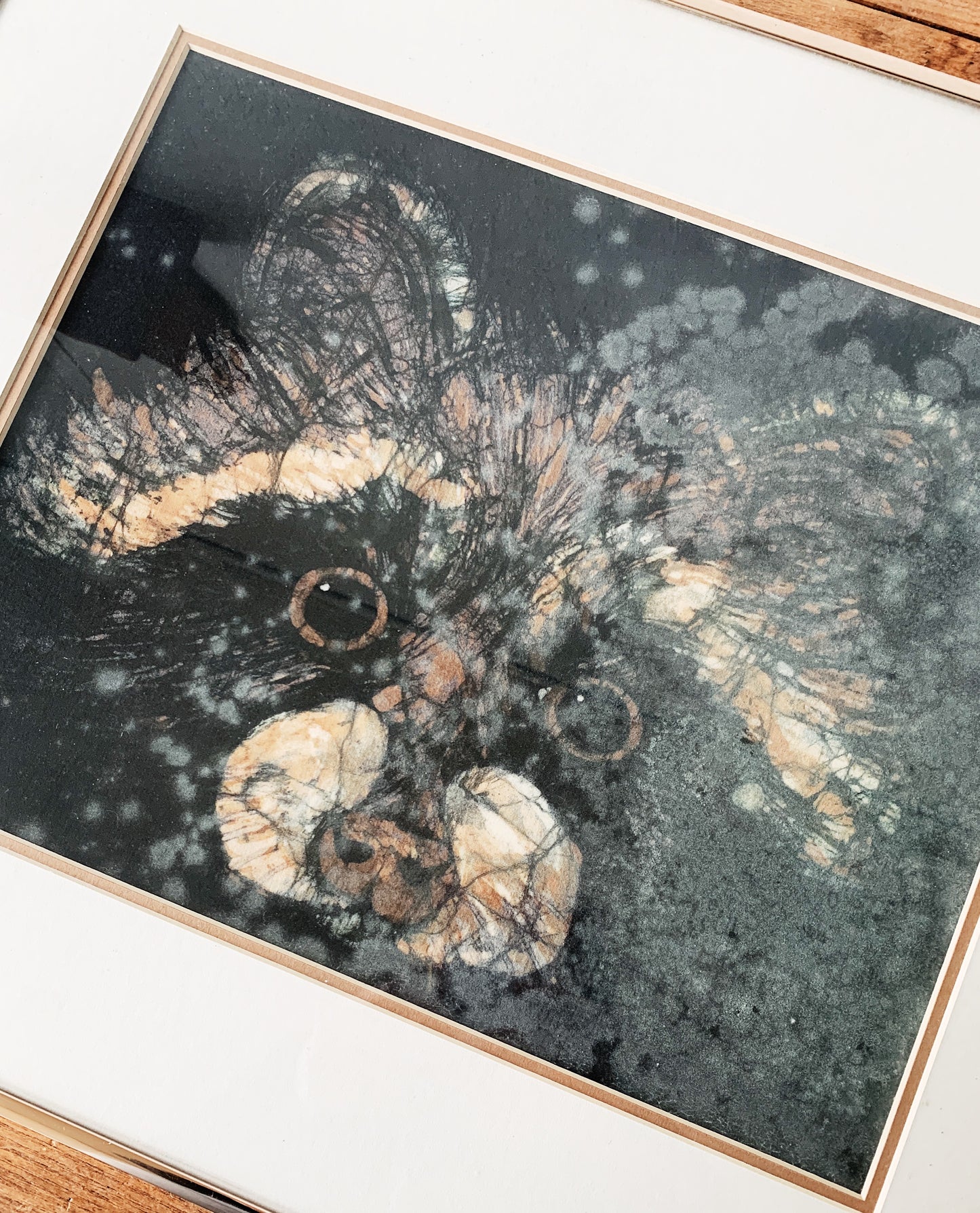 Amazing vintage batik fabric racoon framed under glass. This is really a sweet piece of art! Professionally matted and framed.