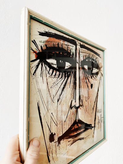 Bernard Buffet was an iconic illustrator/ artist in the 1950s and 60s. Known for his exaggerated forms and use of color. This is a framed record jacket from his work for Ella Fitzgerald’s Gershwin songbook. A bit of a collectors item. Framed under glass in vintage painted wood.