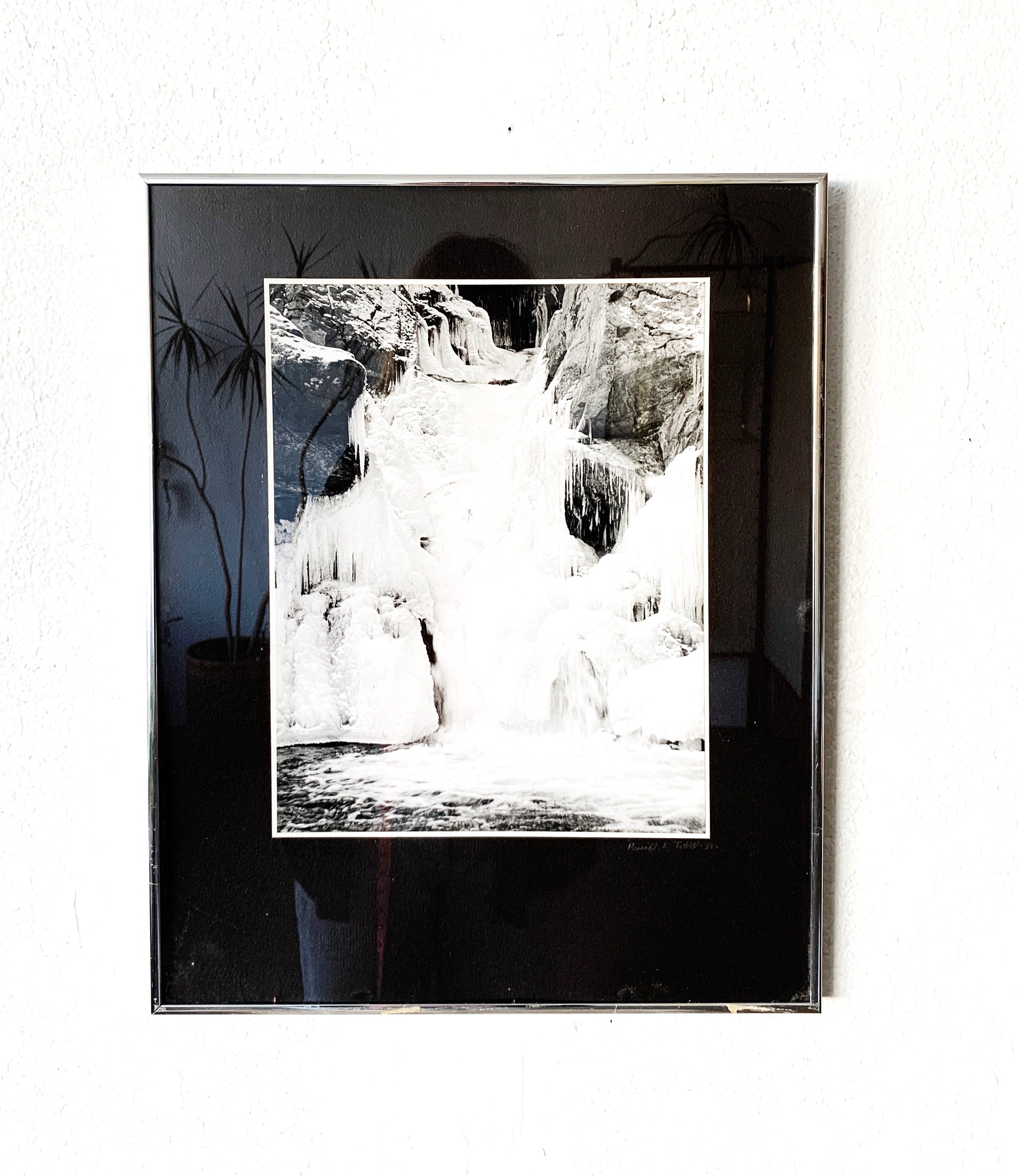 Vintage framed black and white photo of an icy waterfall. Really cool shot. Professionally matted and framed. Signed. In a metal gallery frame with wire hanger.