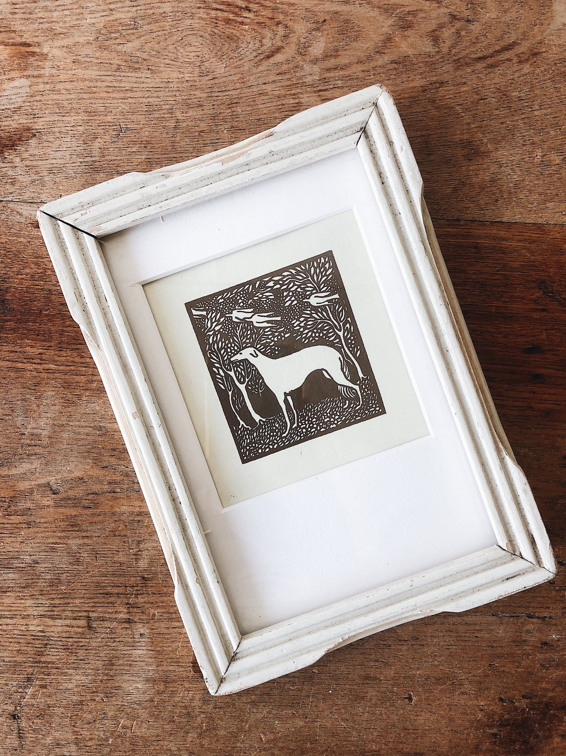 Sweet little bookplate, originally a block print, framed in vintage wood under glass