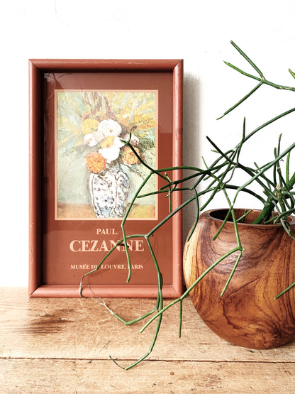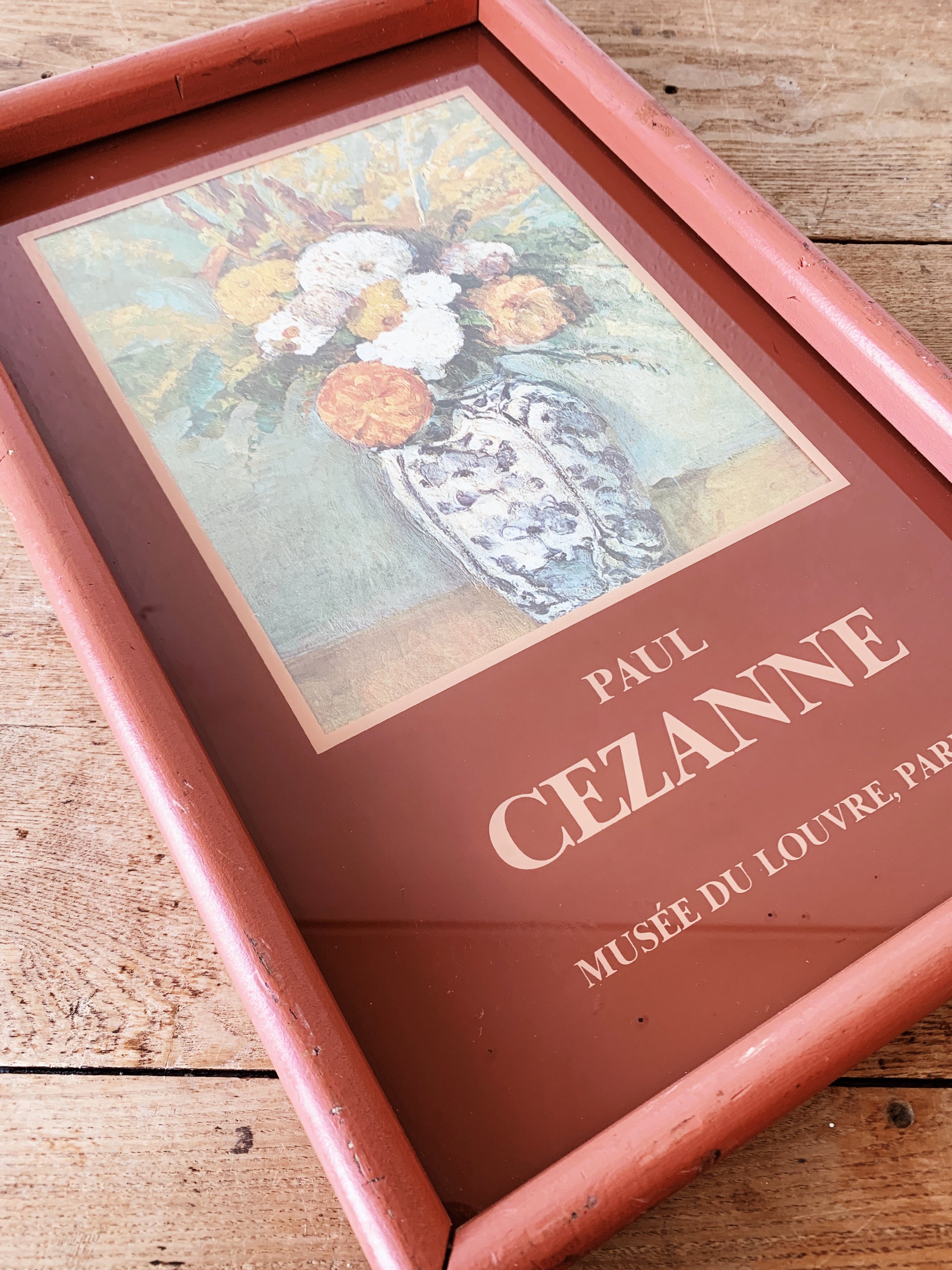 Vintage frame Paul Cezanne print from the Musee Du Louvre, Paris. Love the dark coral framing and background on the print. The frame is beat up but structurally good, priced accordingly. Hanger on back, under glass.