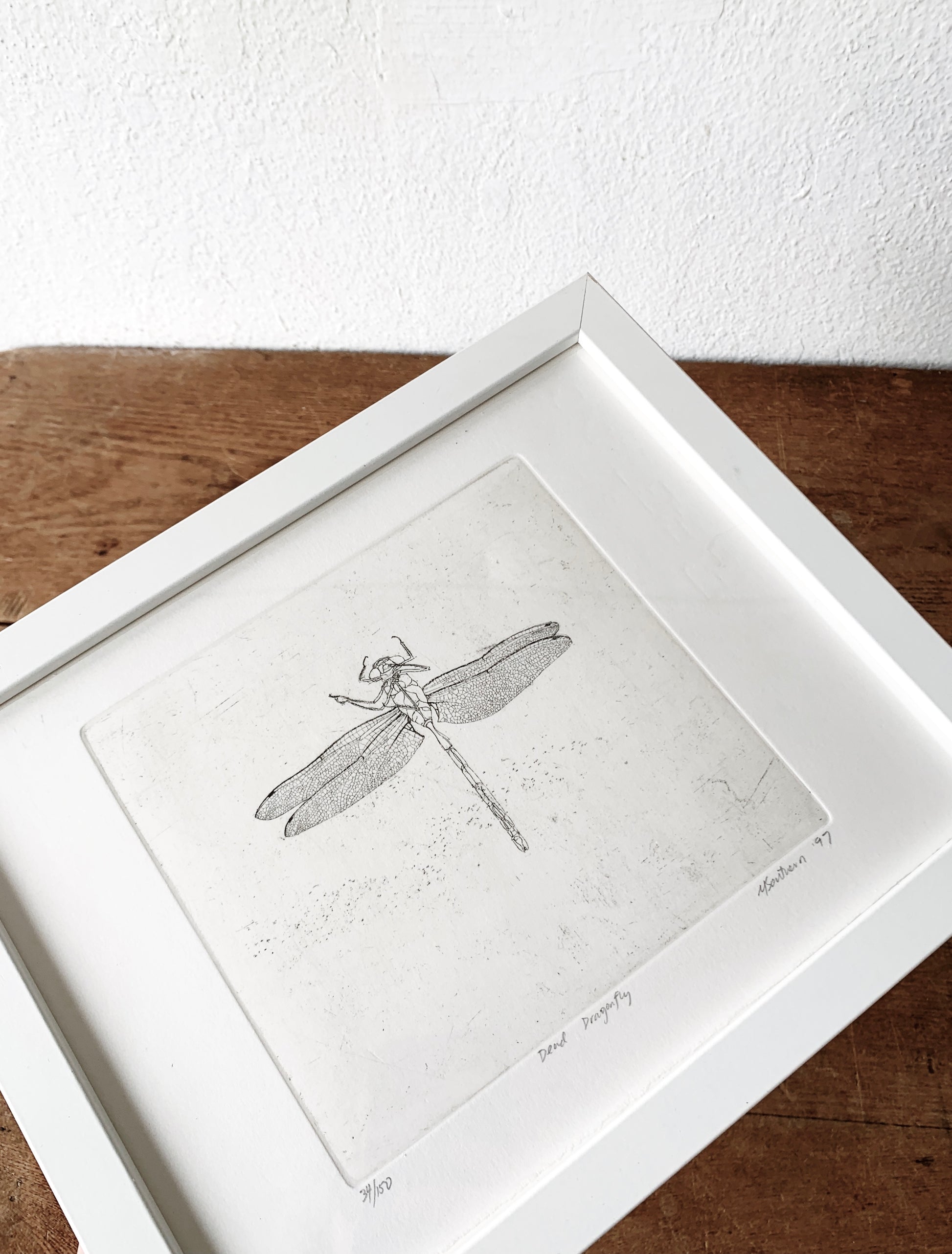 ‘Dead Dragonfly’ etching c1997. Signed and dated. 34/150. Comes framed in the simple contemporary white frame. Can purchase print alone or framed , please select at checkout