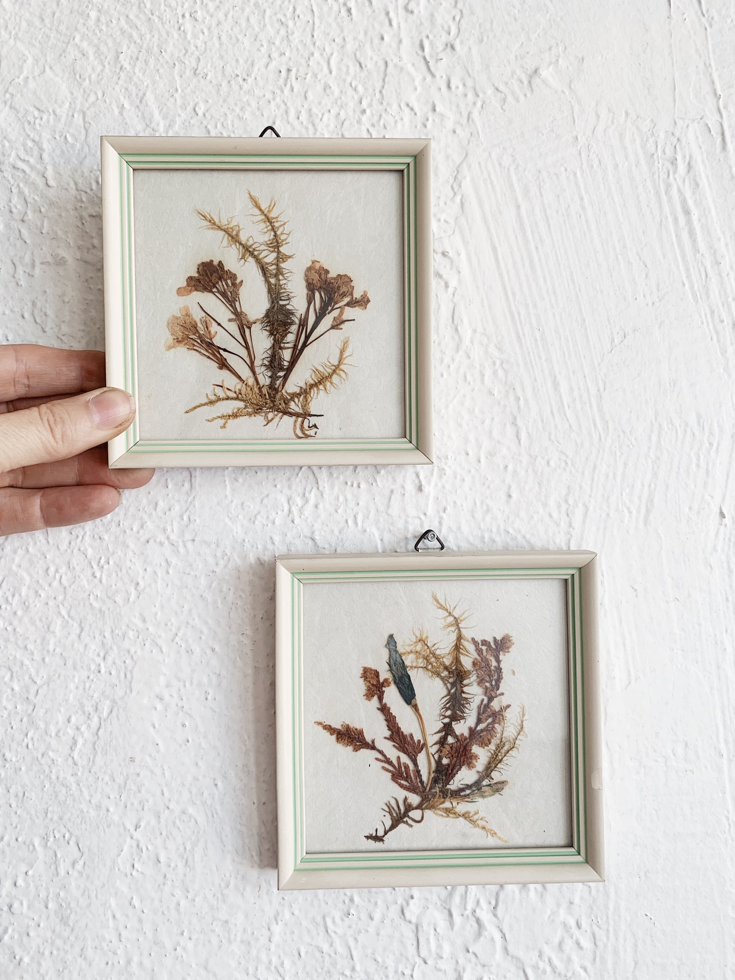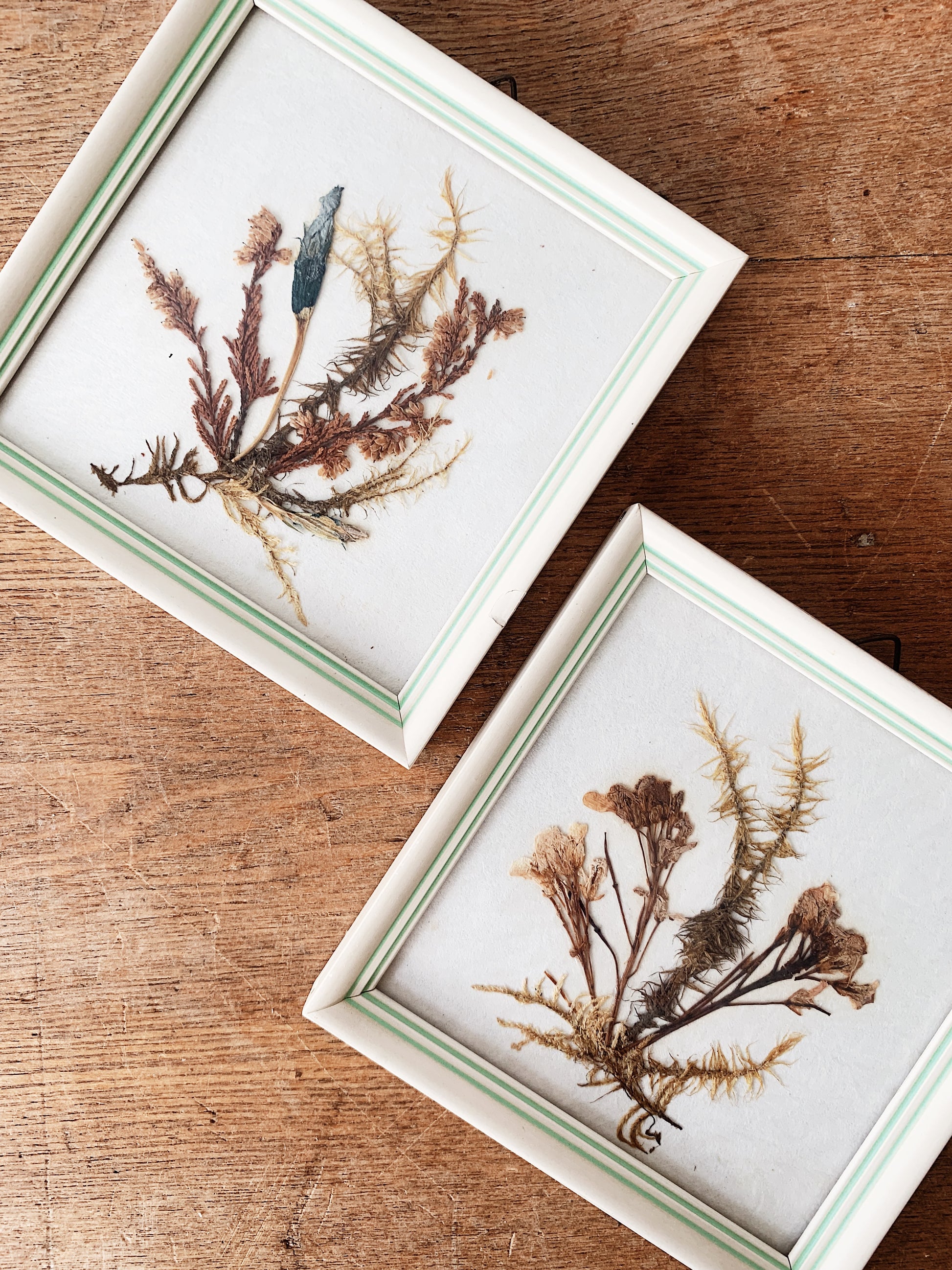 Vintage framed dried flowers. Sweet little wood frames with triangle hangers on top.