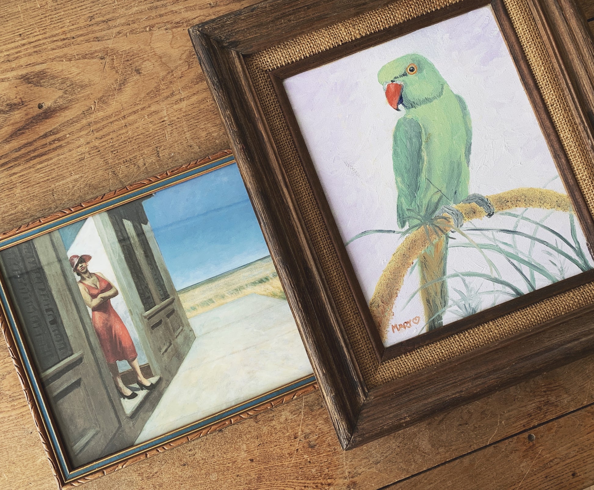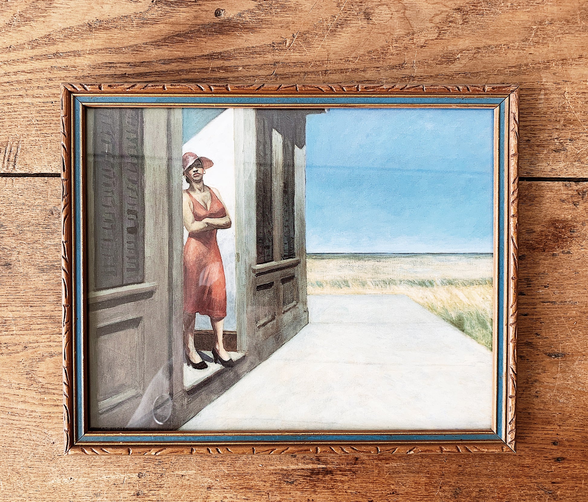 Love this vintage Ed Hopper print. She is t taking any BS!!! Framed in vintage carved wood under glass. Wire hanger.