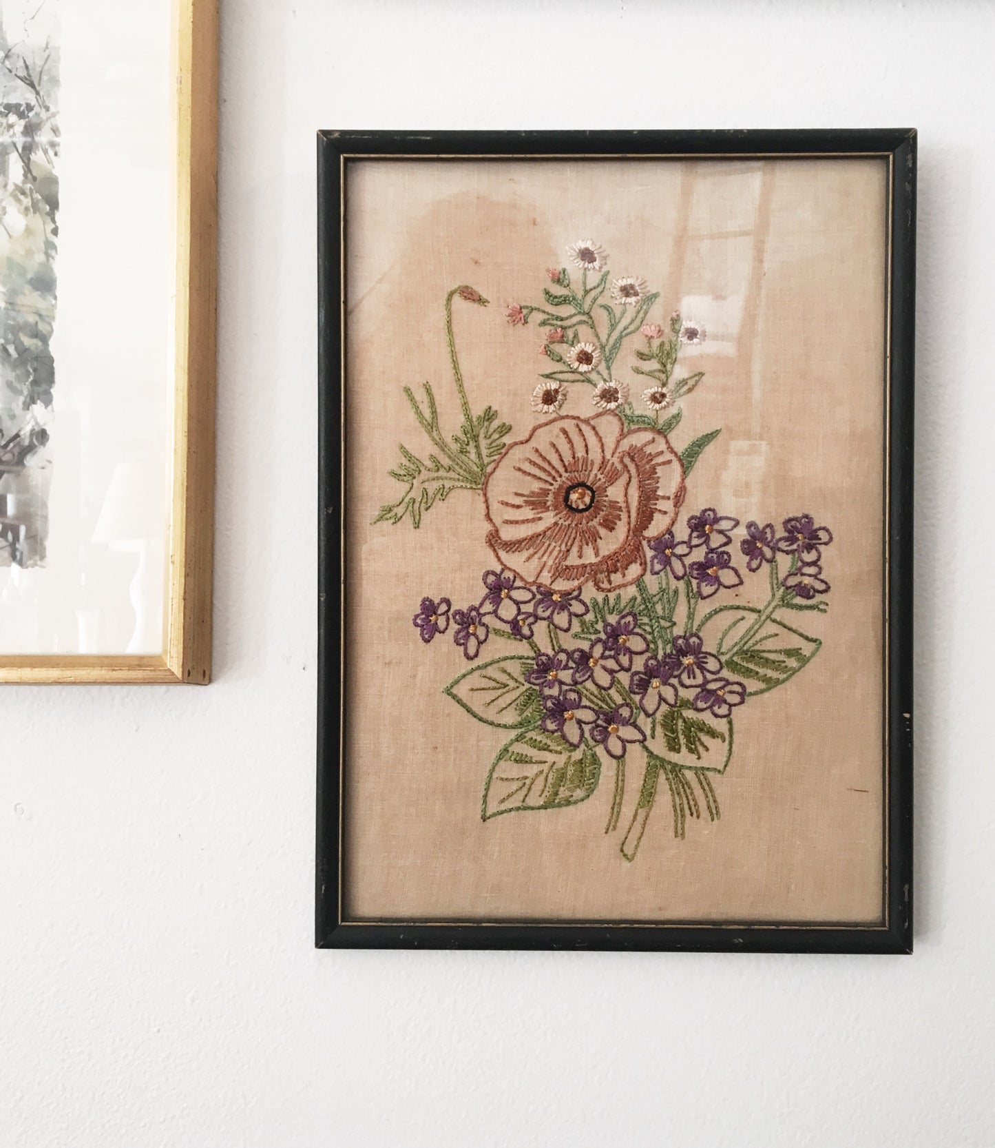 Lovely vintage framed floral embroidery. Under glass, nice old frame.