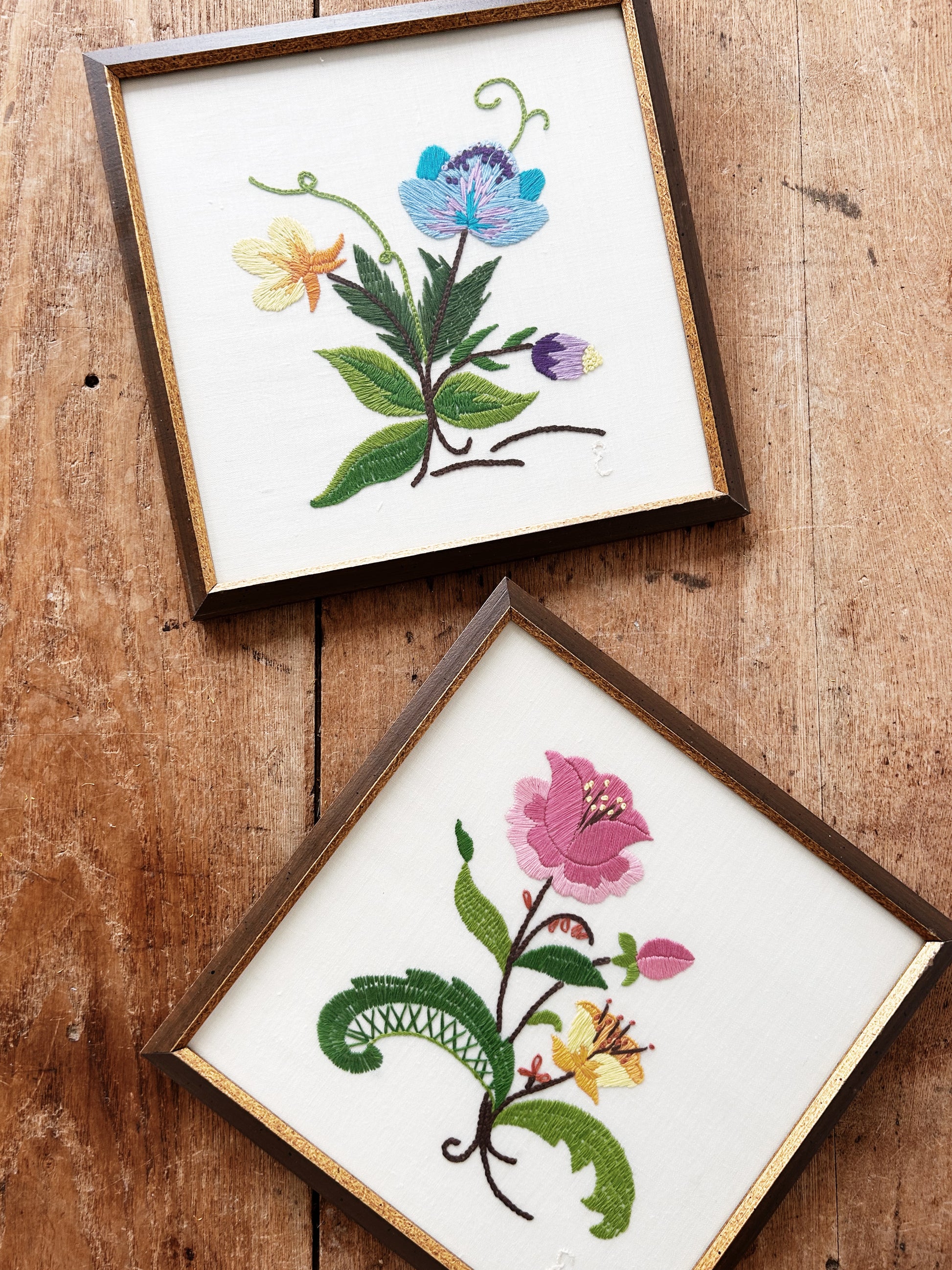 These are so beautifully done. Vintage signed embroidery flower study. Professionally framed under glass. Sold separately or as a pair