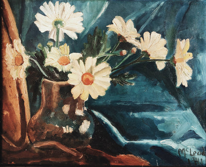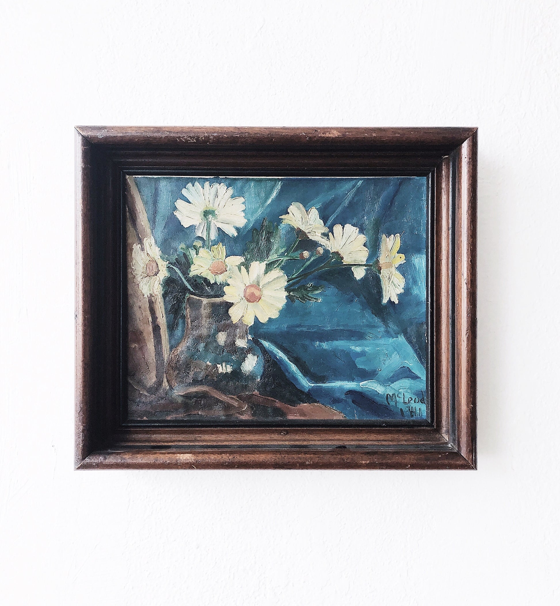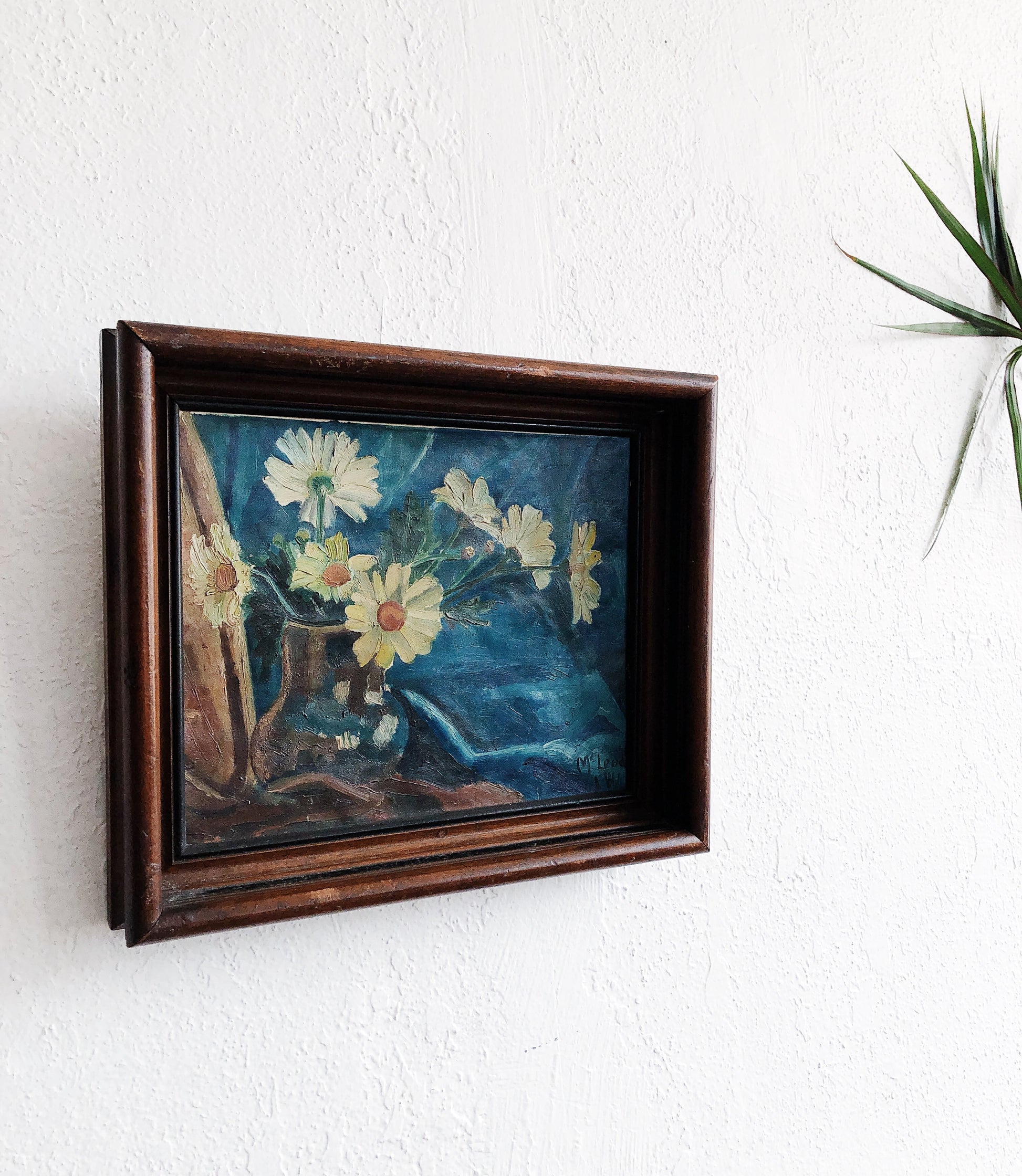Really lovely floral still life in the prettiest of colors. Nice texture and choppy composition. Dated 1941 in an original old wood frame. We really Love this one