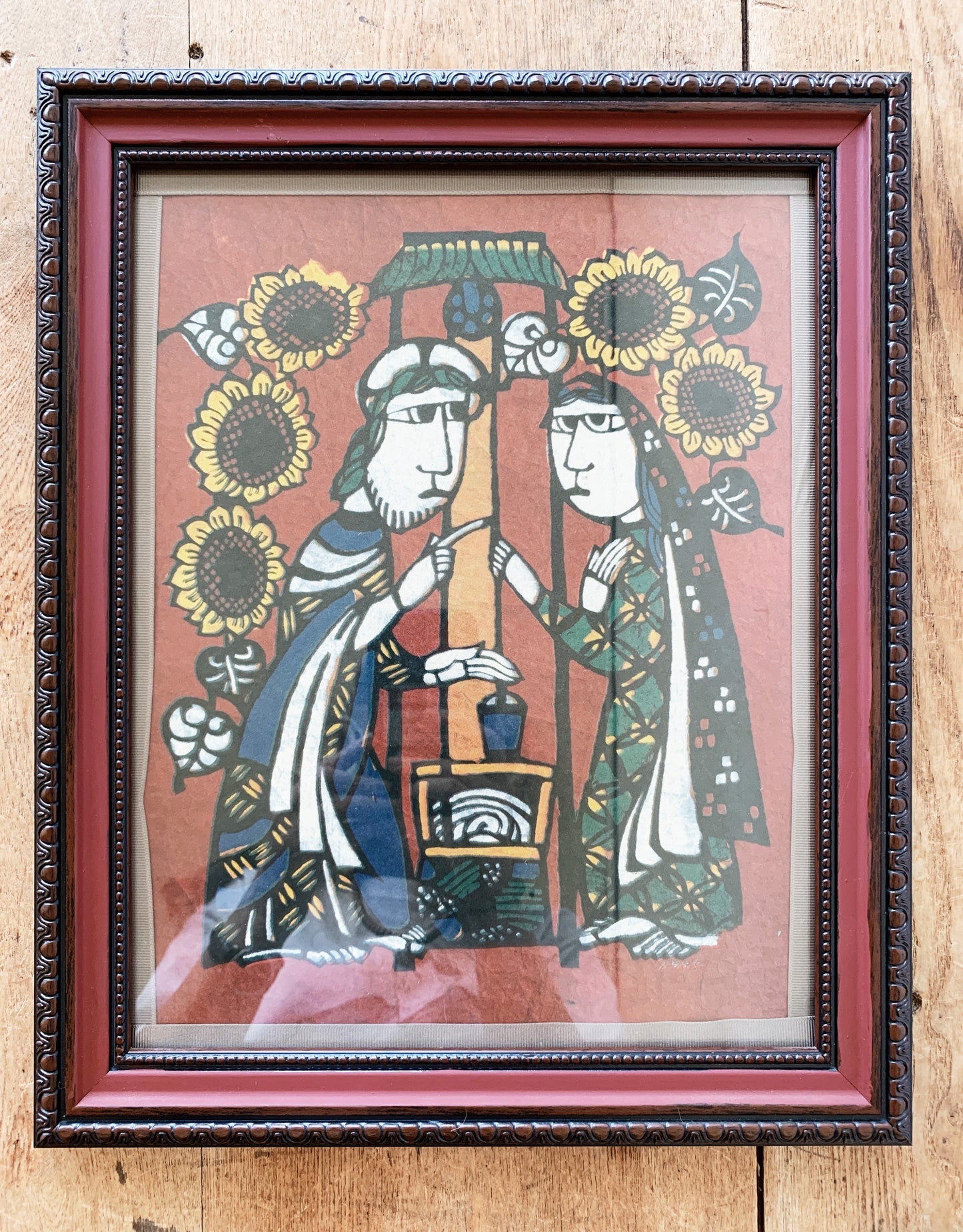 Wonderful vintage folk art print in a contemporary frame. Love the sunflowers, and what appears to be a ceremony, It’s lovely.