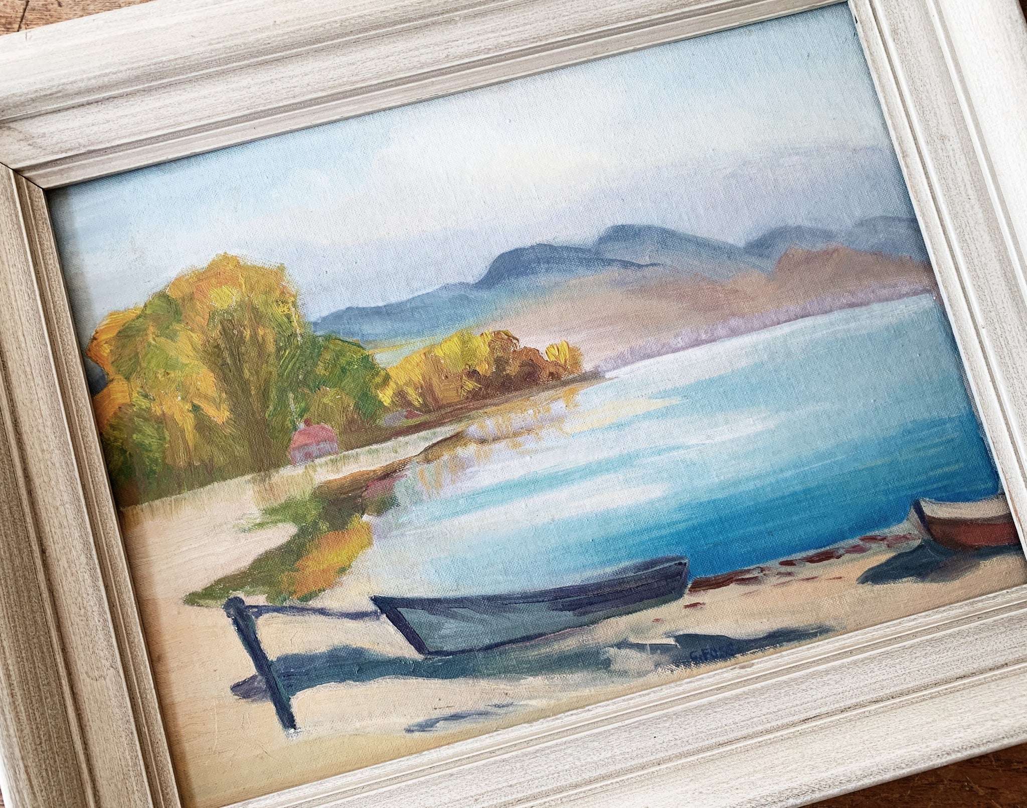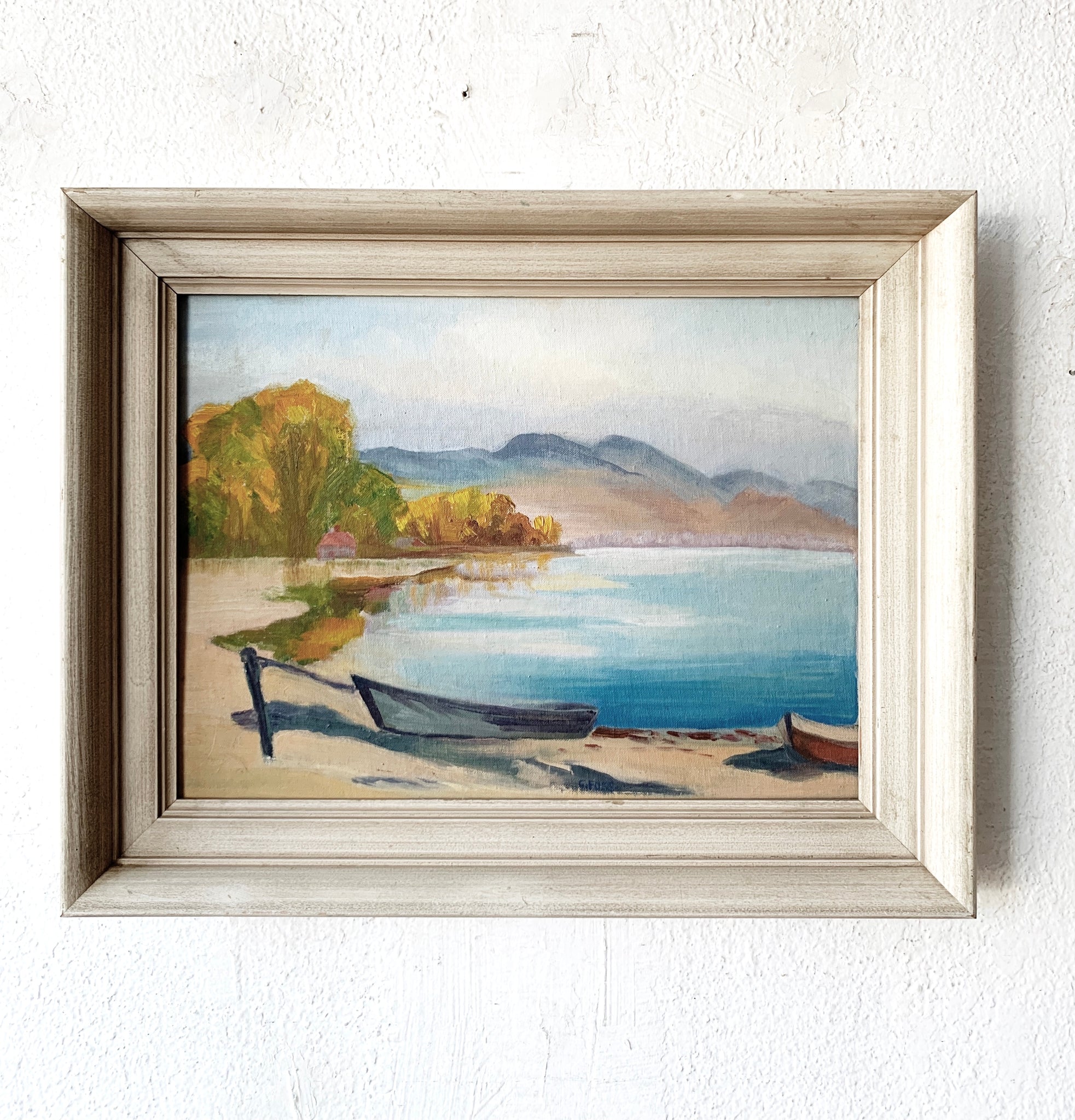Very peaceful lake setting with prettiest, calming brushstrokes and colors. Framed in vintage whitewashed wood.