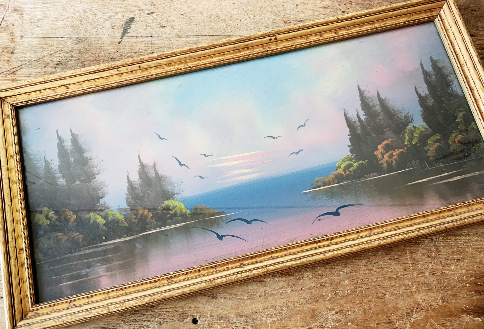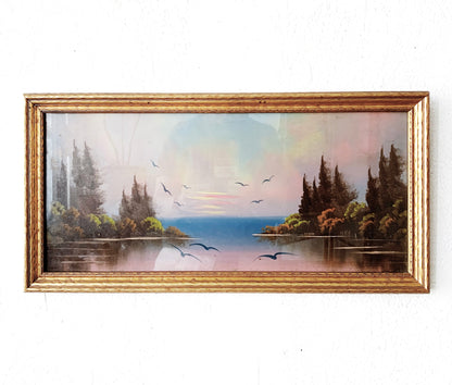 Magical vintage framed landscape painting with lovely pinks and birds in flight.