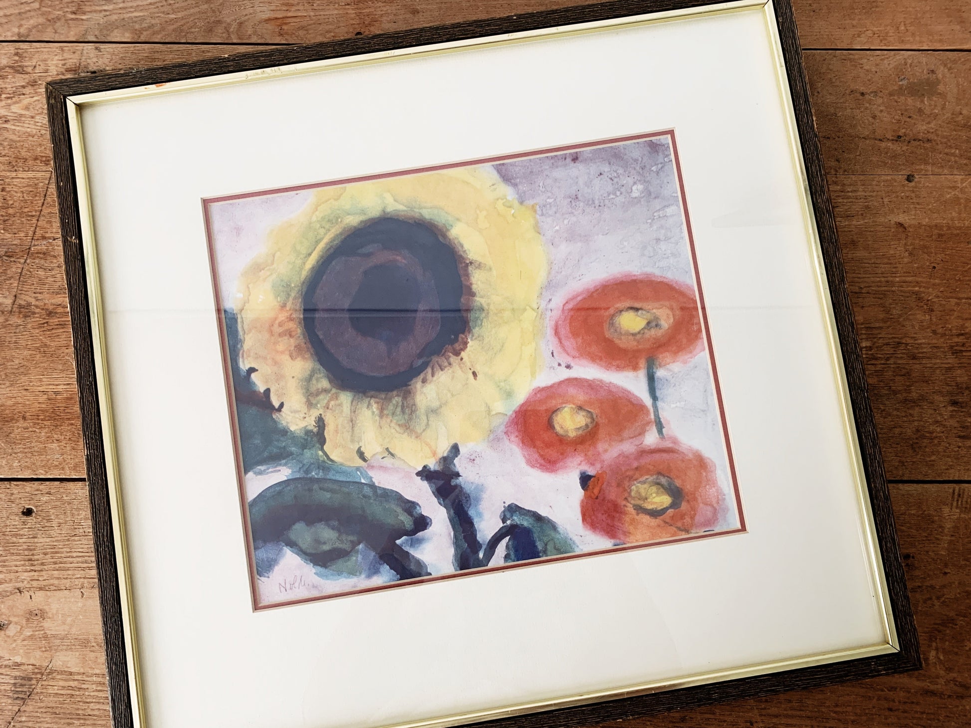 Happy litho of watercolor flowers. Professionally matted and framed in vintage wood with wire hanger on back. Signed.