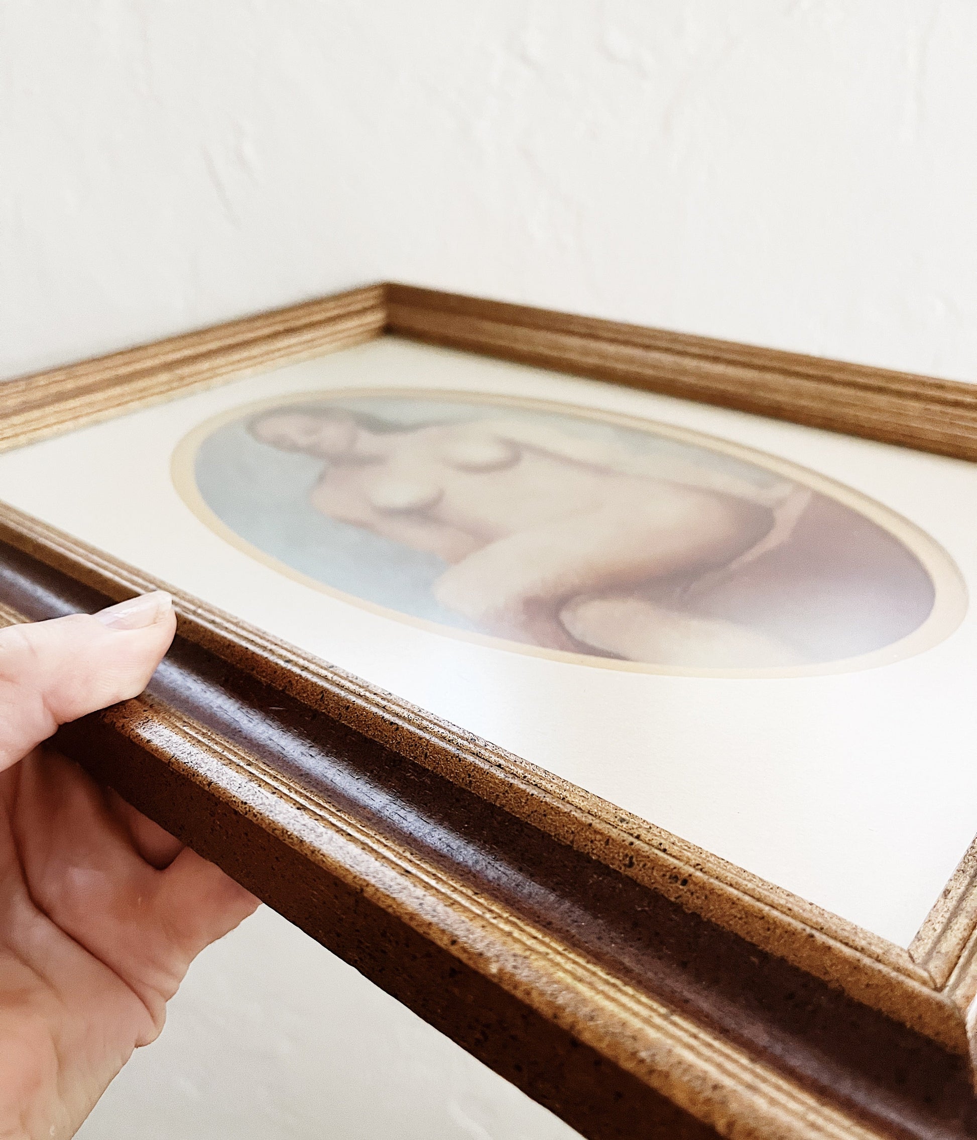 Modigliani esque litho framed in vintage wood under non glare glass. Intriguing and classic at the same time