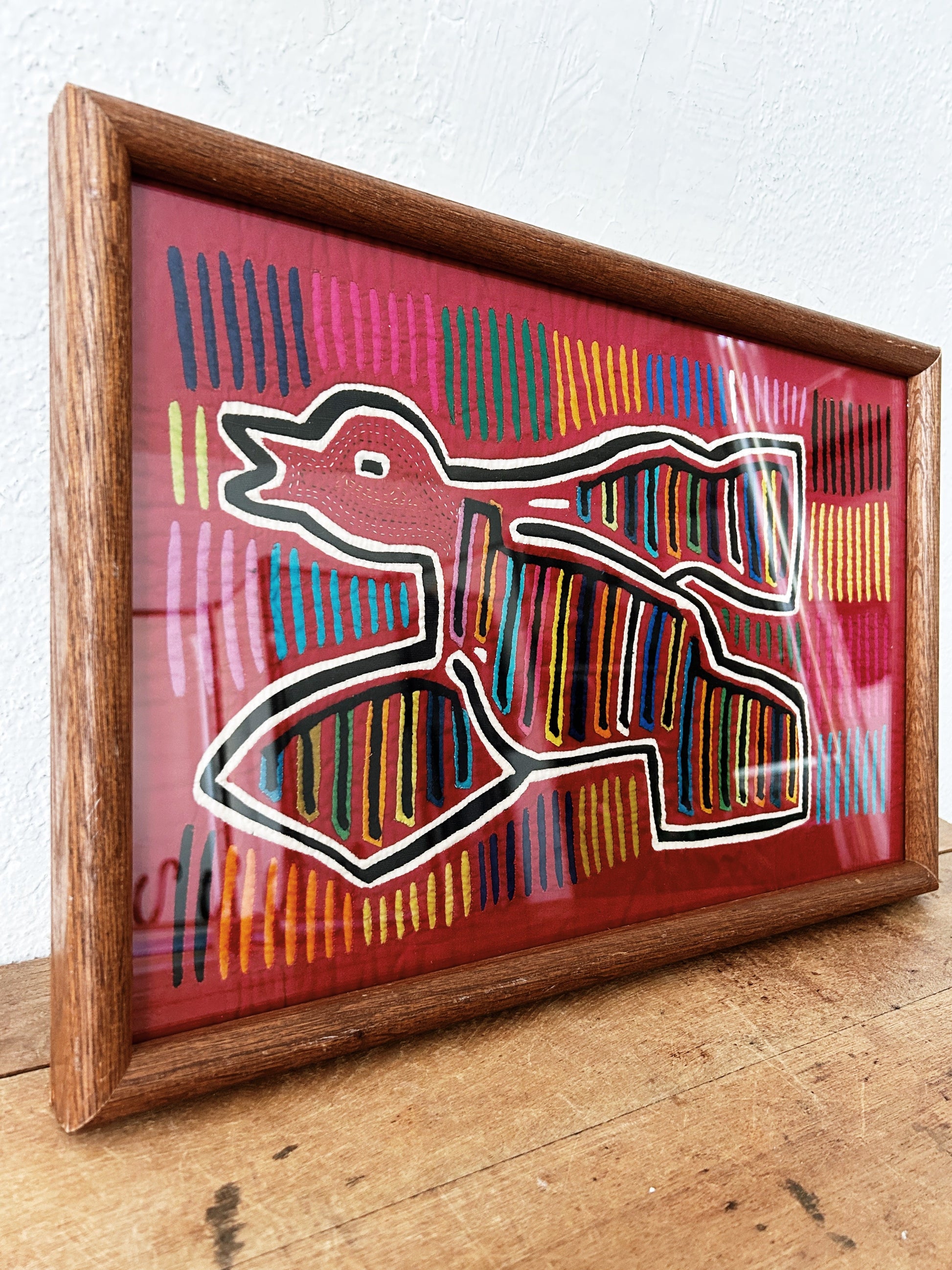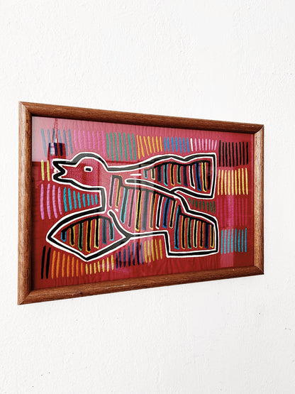 Vintage cotton embroidered traditional mola textile from South America. Professionally framed in vintage wood under glass. Felt pads and wire hanger