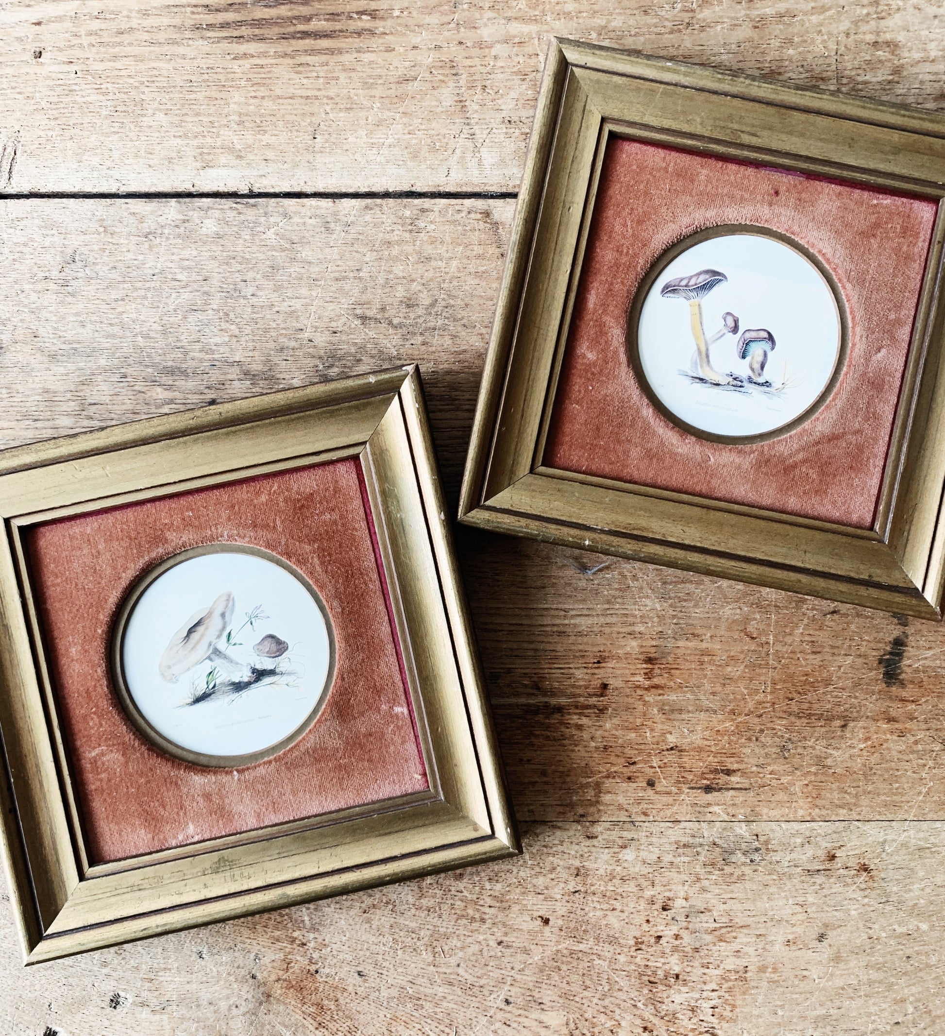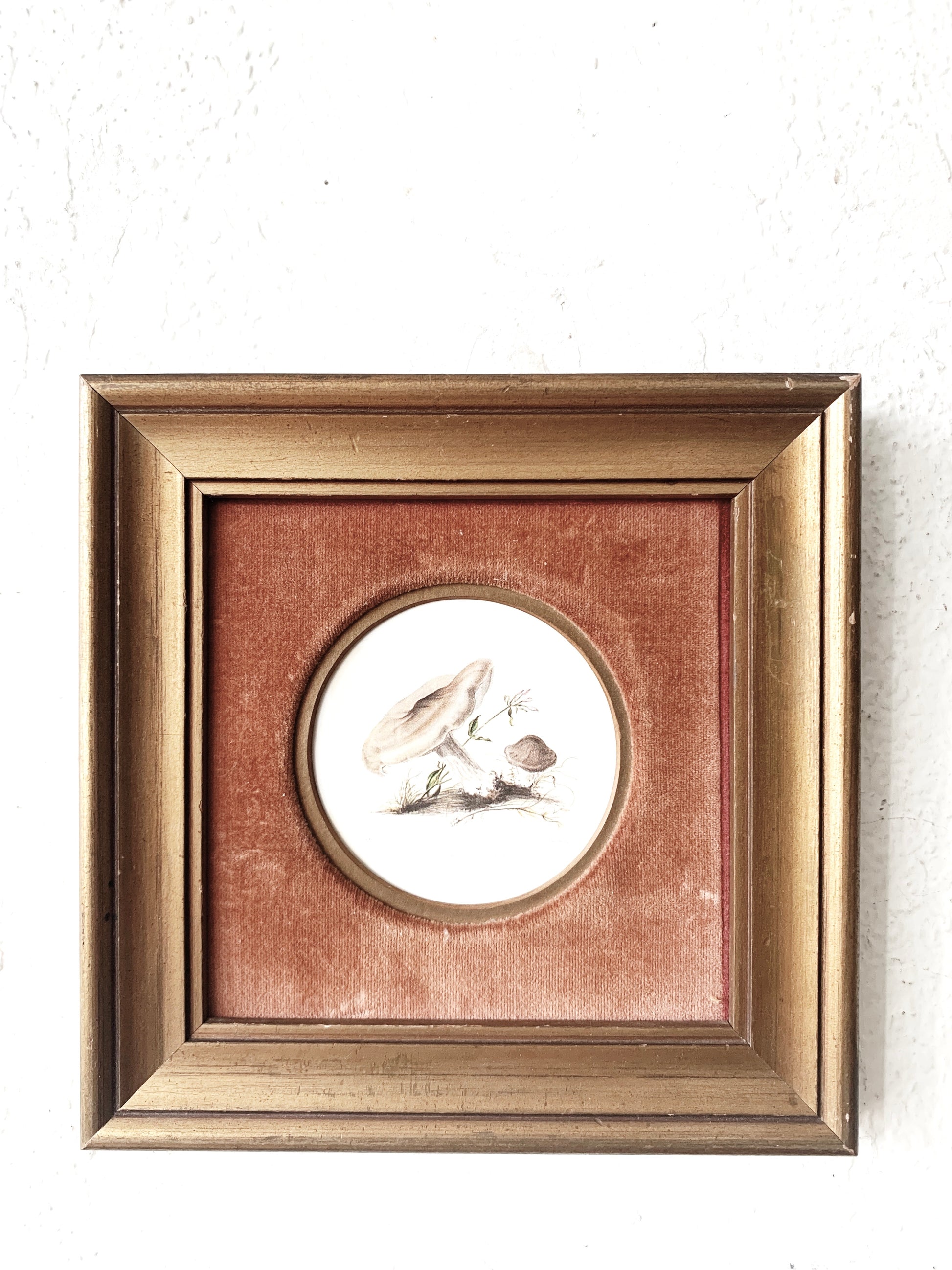 Vintage mushroom prints in the prettiest little wood frames with terra cotta velvet fillet. Hangers on back