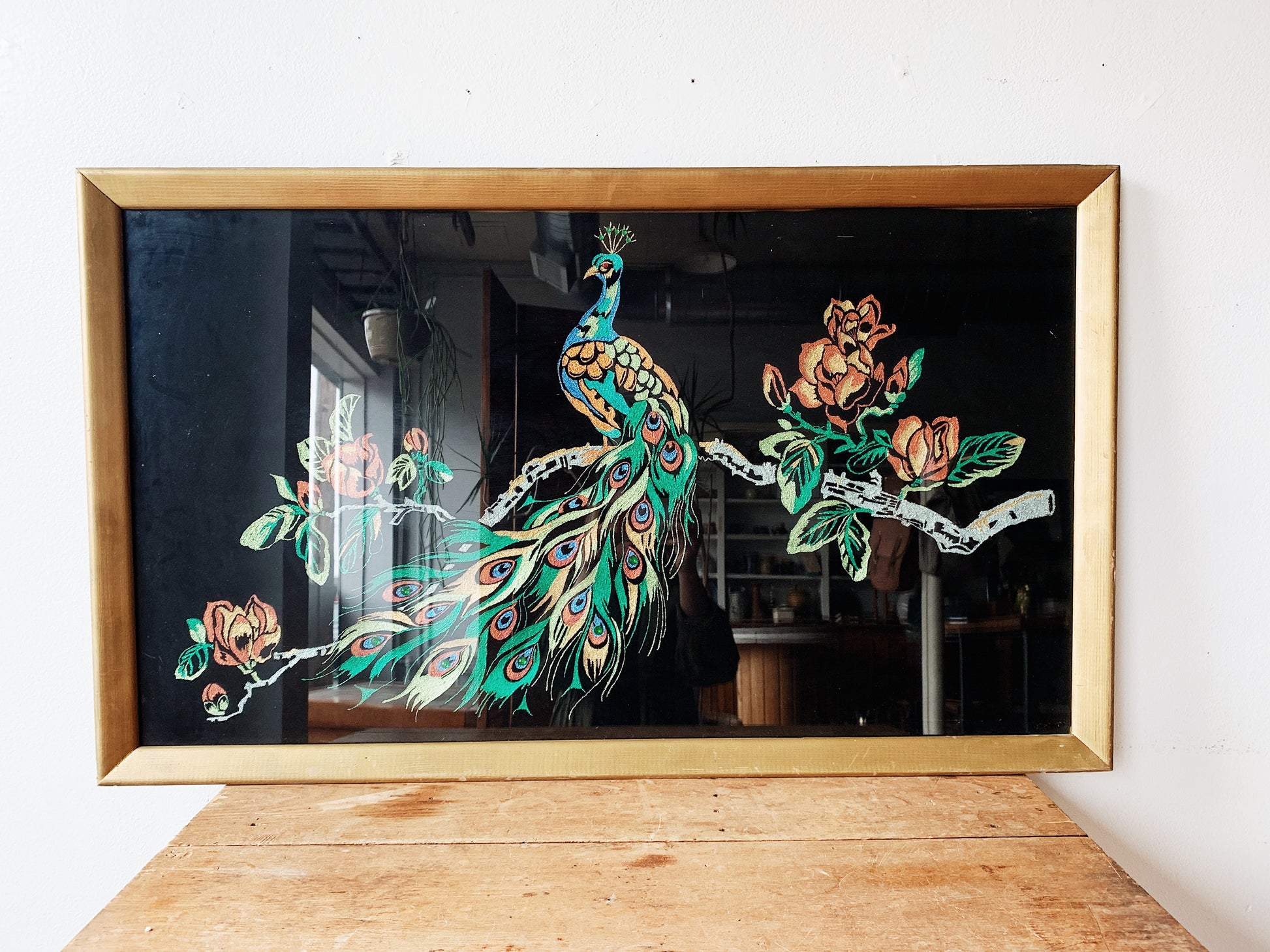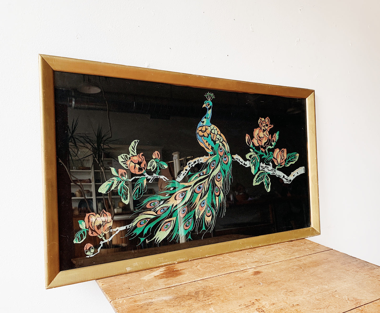 Vintage framed painted velvet peacock on a flowering branch. Wow, she’s somethin!