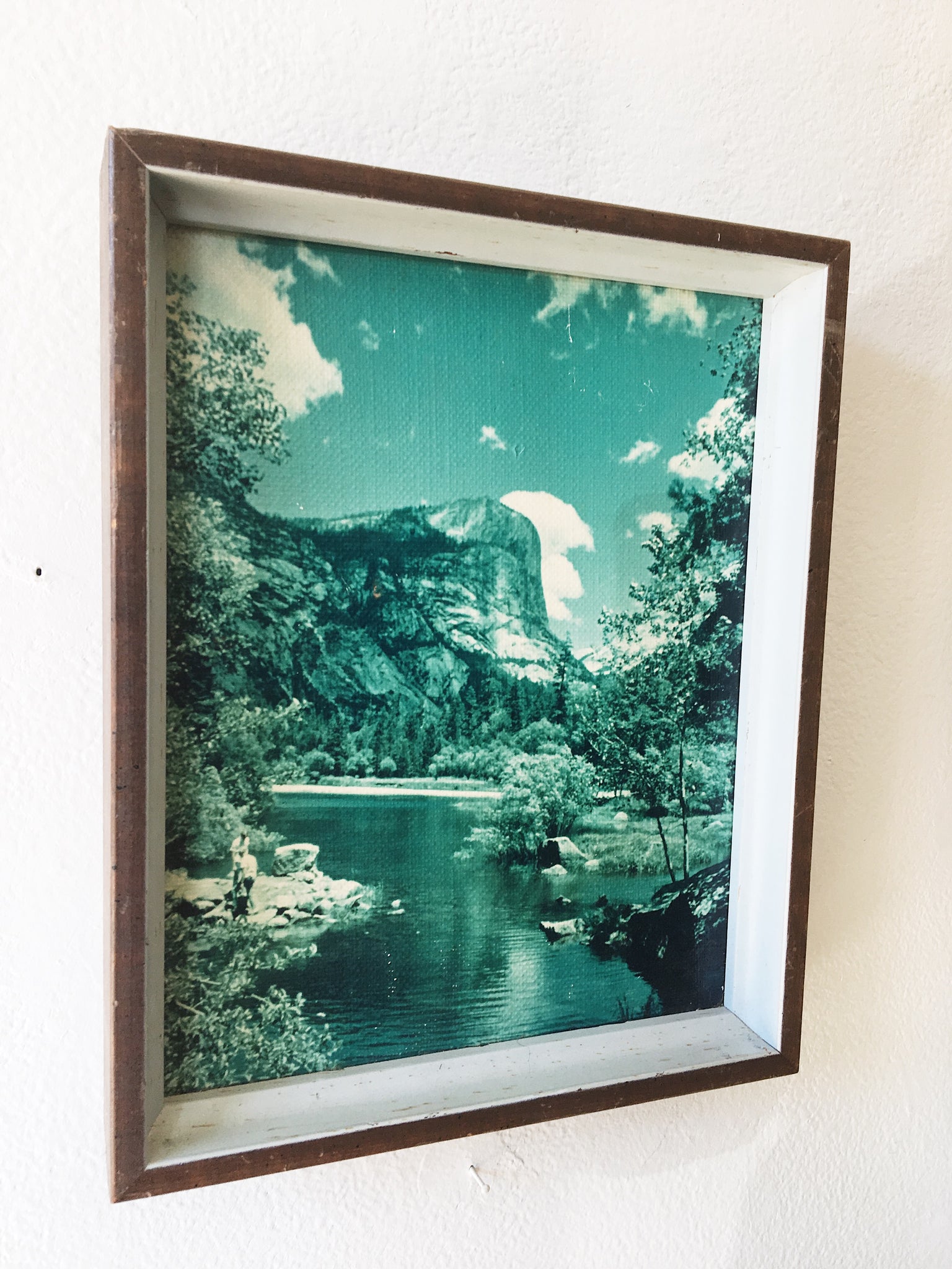 Vintage framed photo, half dome in Yosemite? I’m think No that’s it but it’s not marked. Lovely blue tint, vintage box frame.