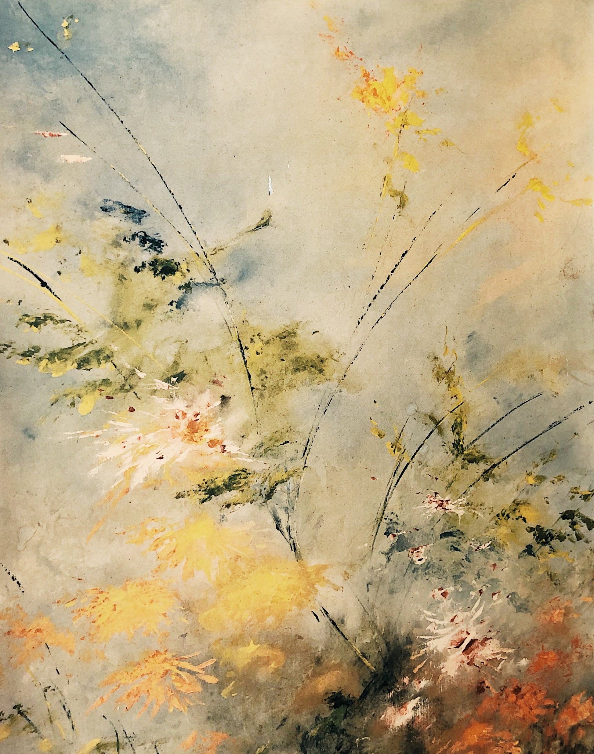 A pressed water colored lithograph that fooled us into thinking it was a painting. Pretty wispy florals in a carved blue frame