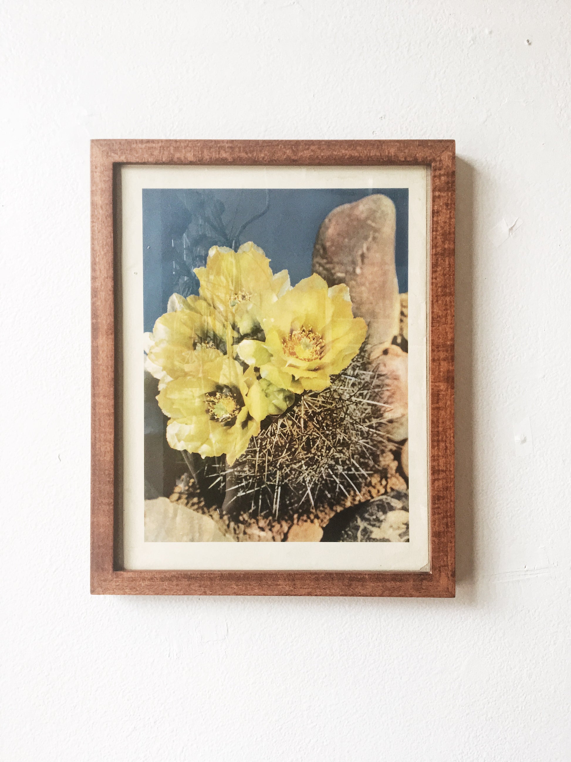 Lovely vintage framed print of a blooming cactus. Simple wood frame.