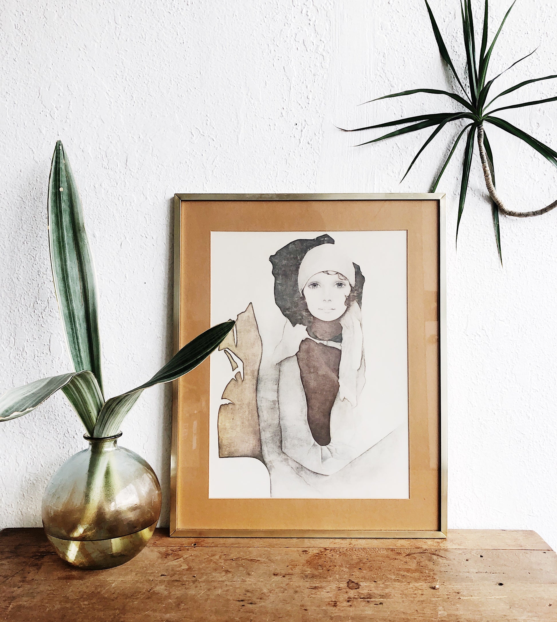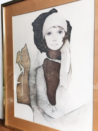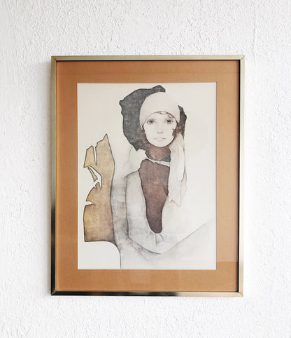 Vintage framed 1970s Rosamond print in perfect condition. Linen stock. Matte Gold frame, under glass.