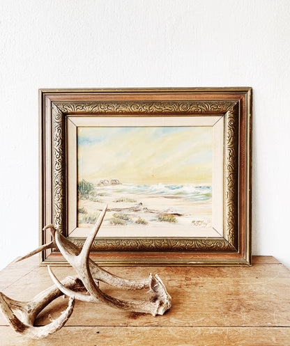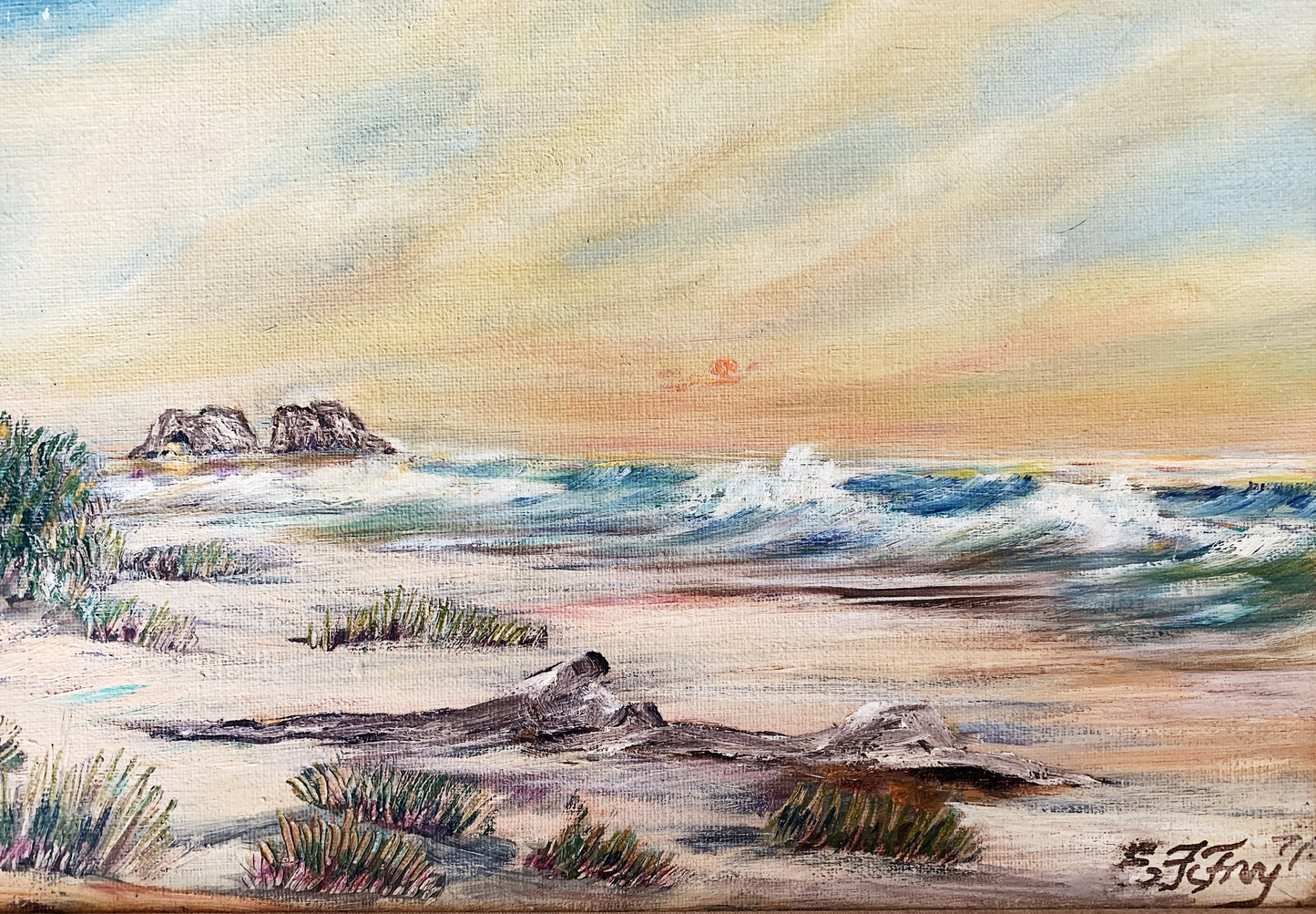Pretty yellow sky in this early 1970’s seascape painting. Signed and dated.