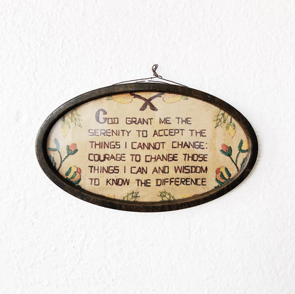 Sweet little framed vintage serenity prayer litho. Has the appearance of a needlepoint and makes it all the charming. Metal frame under glass