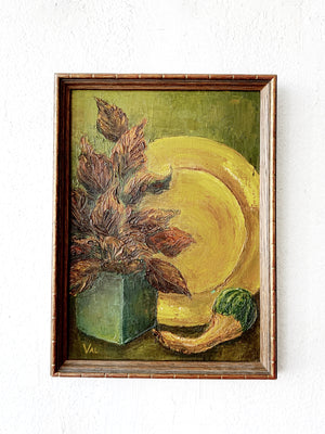 Beautiful dark earthy colors done in oil. This is a gorgeous vintage still life painting, signed and framed in wood with wire hanger
