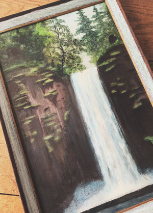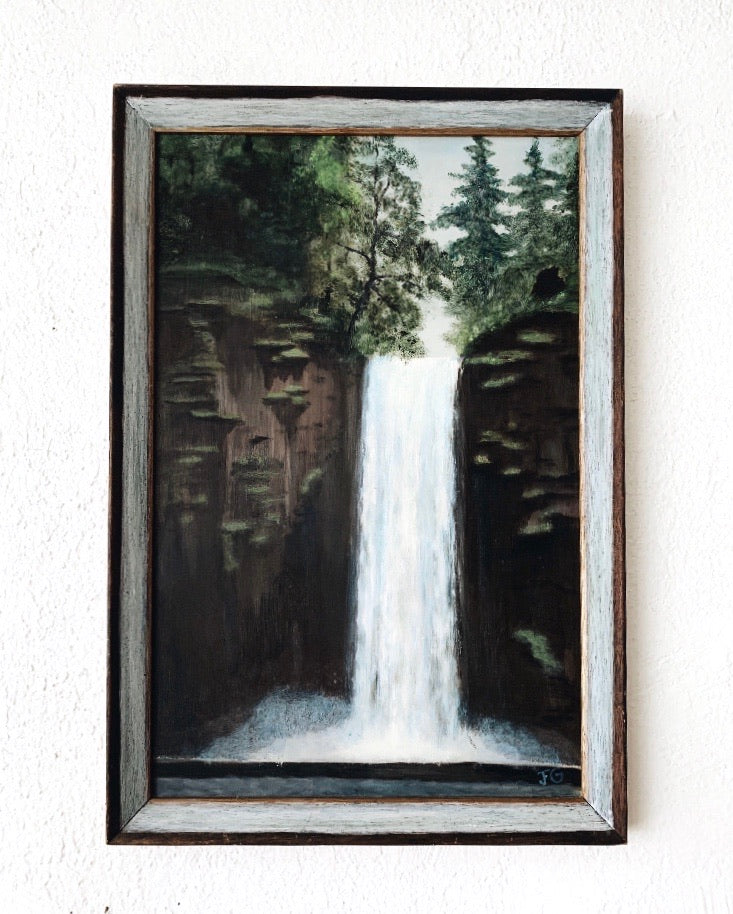 Beautiful, vintage moody Multnomah Falls waterfall painting framed in salvaged wood. A stunner!