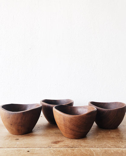 Beautiful set of four teak bowls in an organic mid century shape. Lovely tones and grain to the wood. In excellent condition.
