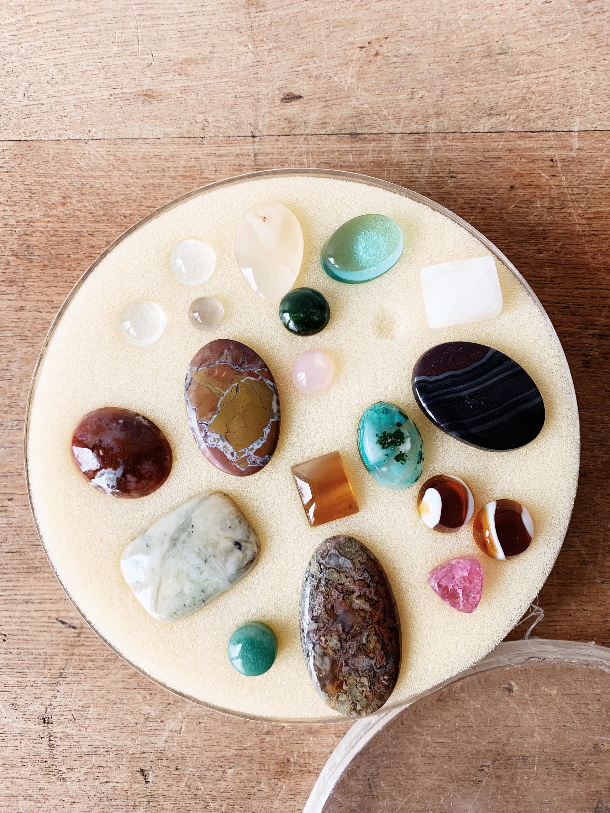 A beautiful collection with 19 stones on either side, 38 total. These are rumbled, polished and cut cabochan style. Easily made into jewelry.