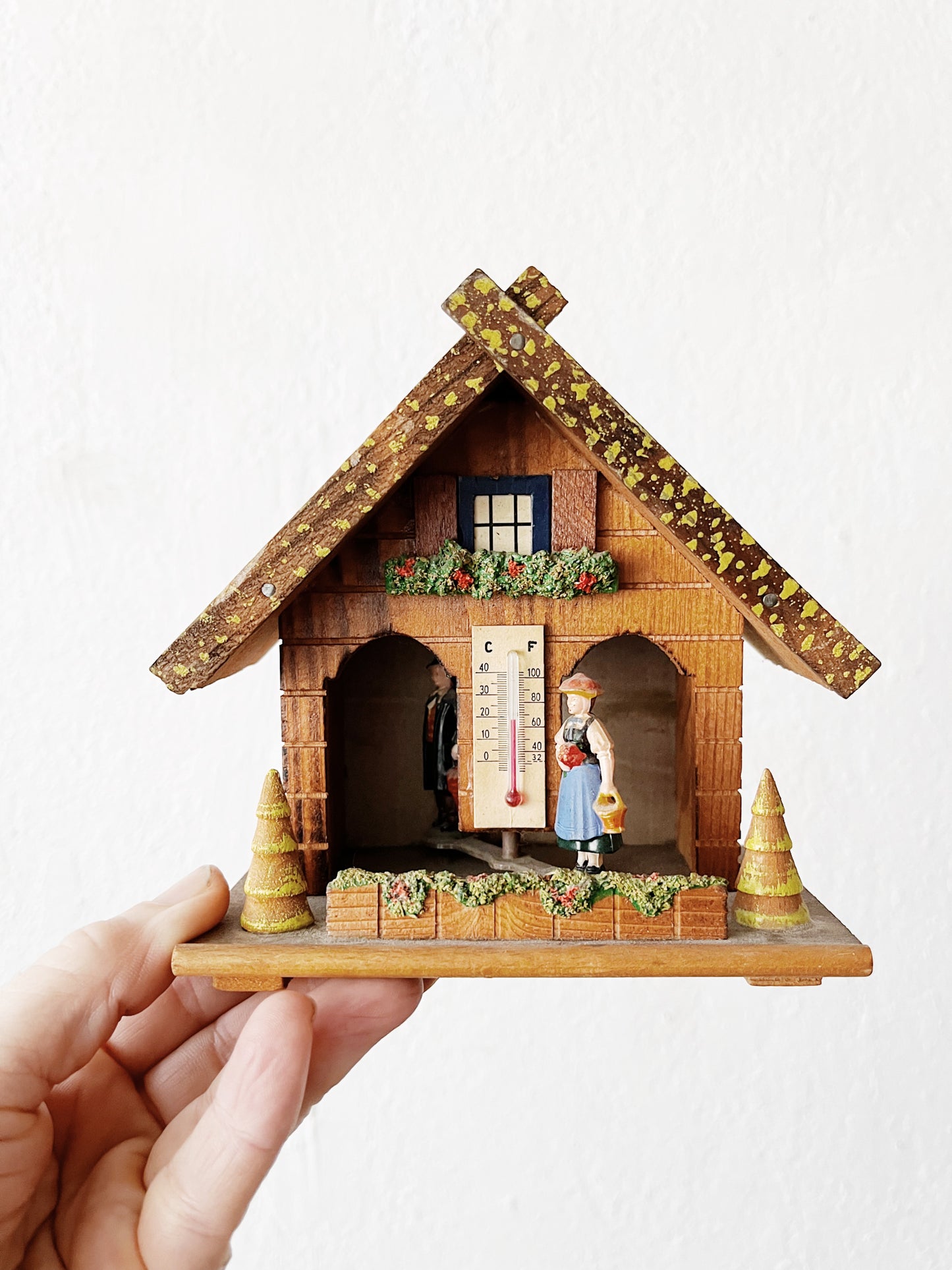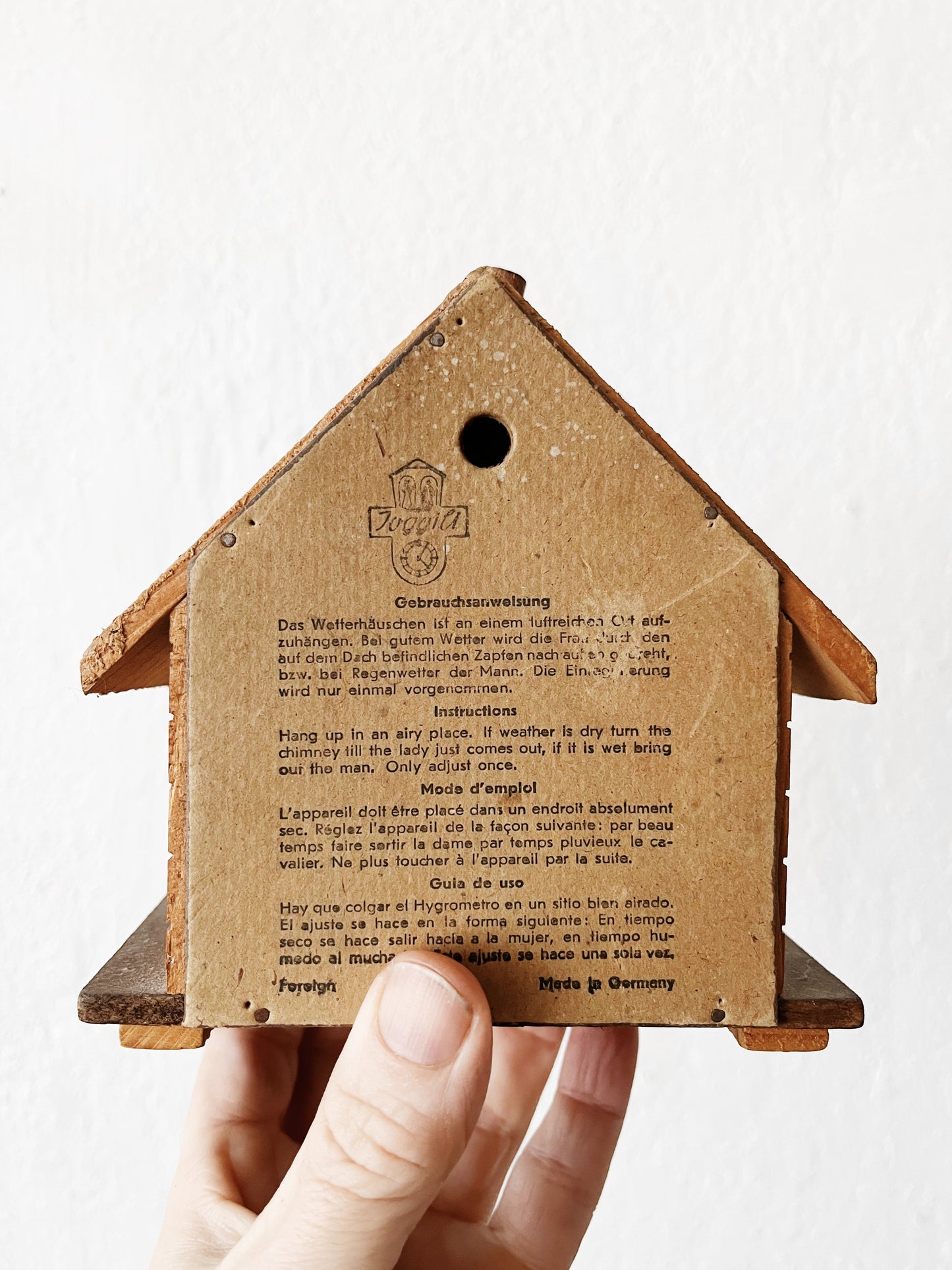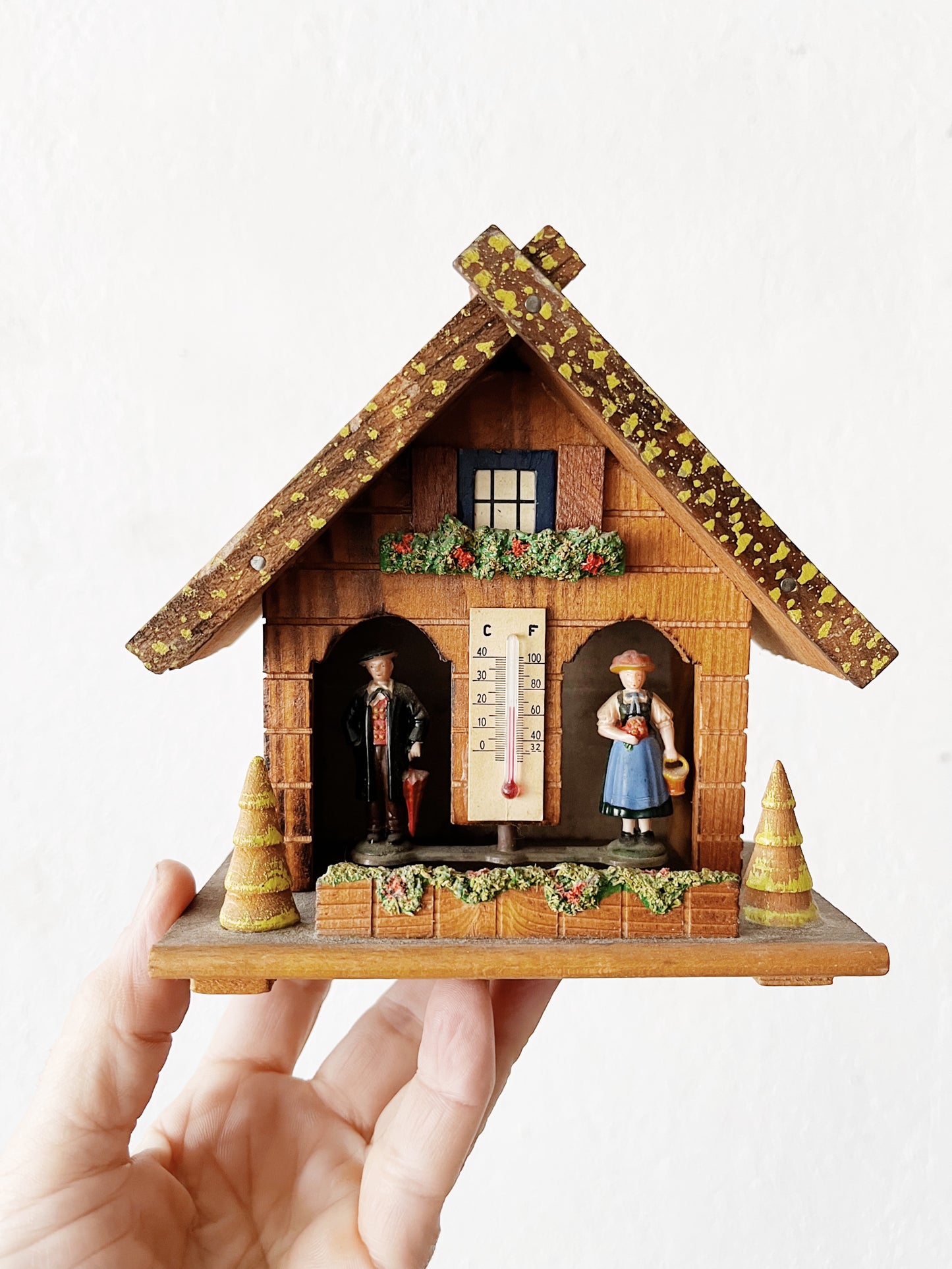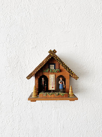 A folk art Weather houses from Germany. It operates on humidity levels....the lady comes out during nice weather and the man comes out when it rains ( or Vice versa, the user can set). Also has a thermometer. Meant to hang on the wall