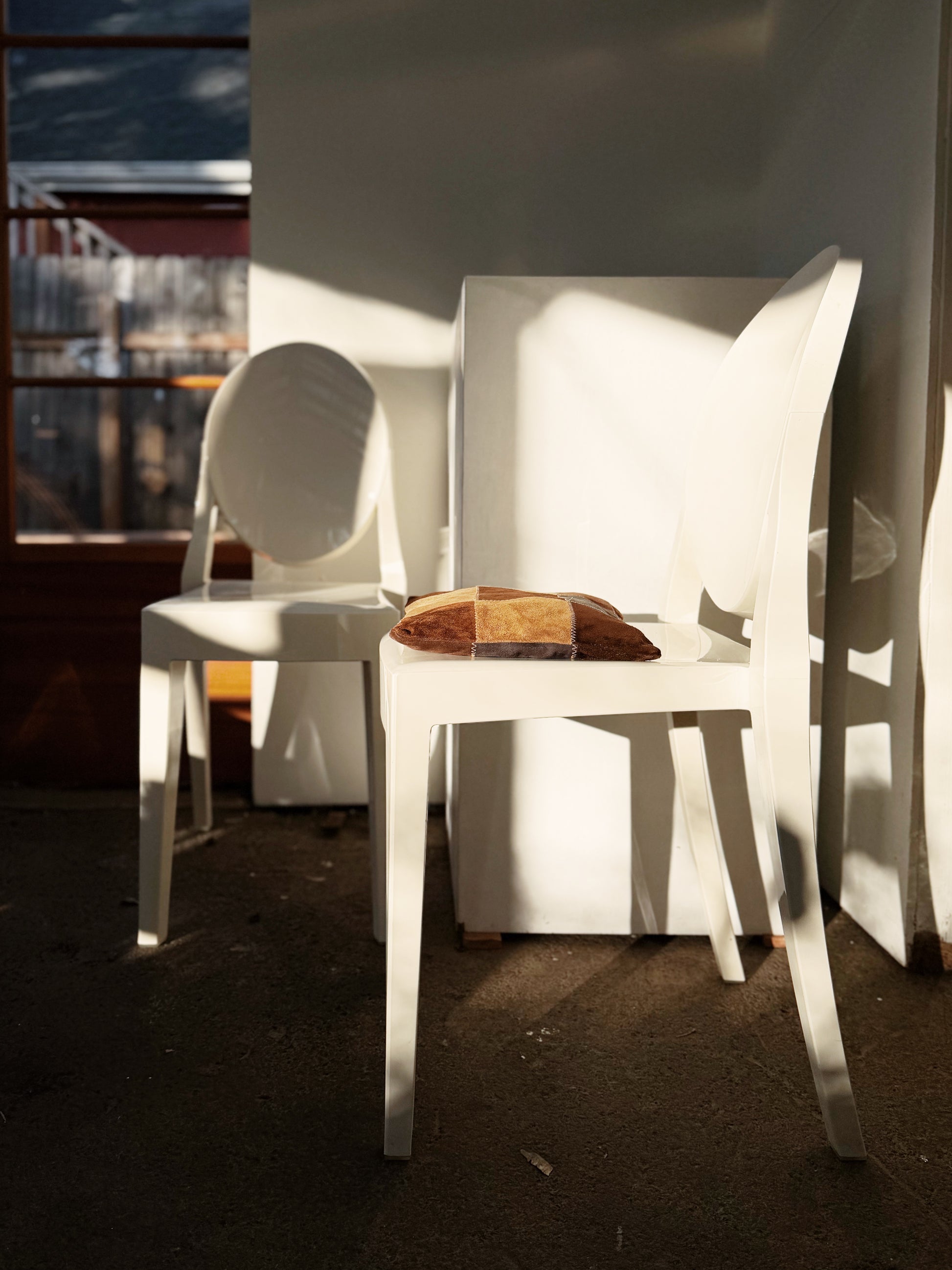 Victoria Ghost Chair by Phillipe Starck for Kartell. Simple modern lines that pair exceptionally well with more rustic decor. Warm white gloss.