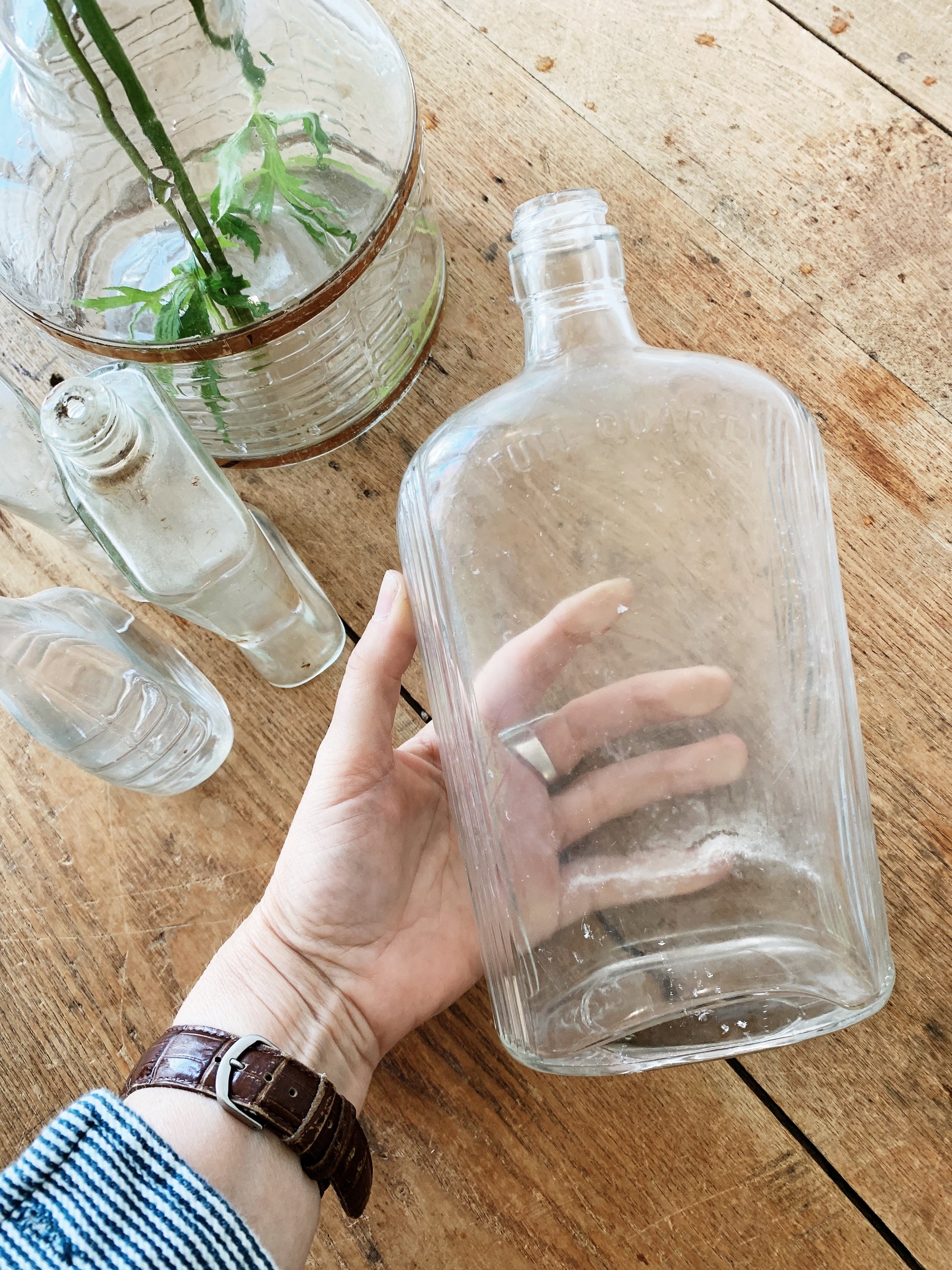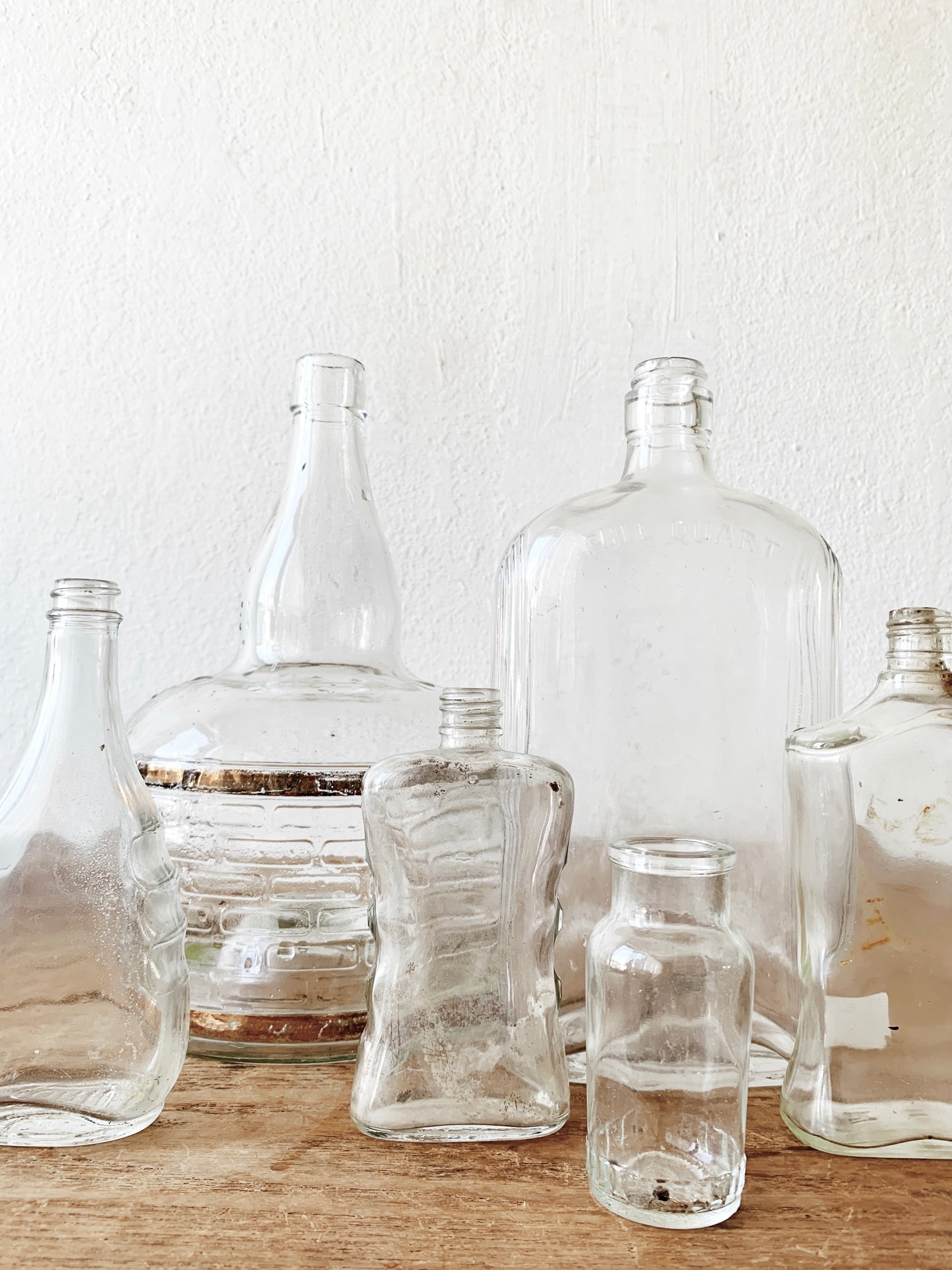 Lovely old glass collection. Includes 6 bottles varying from 3-10”