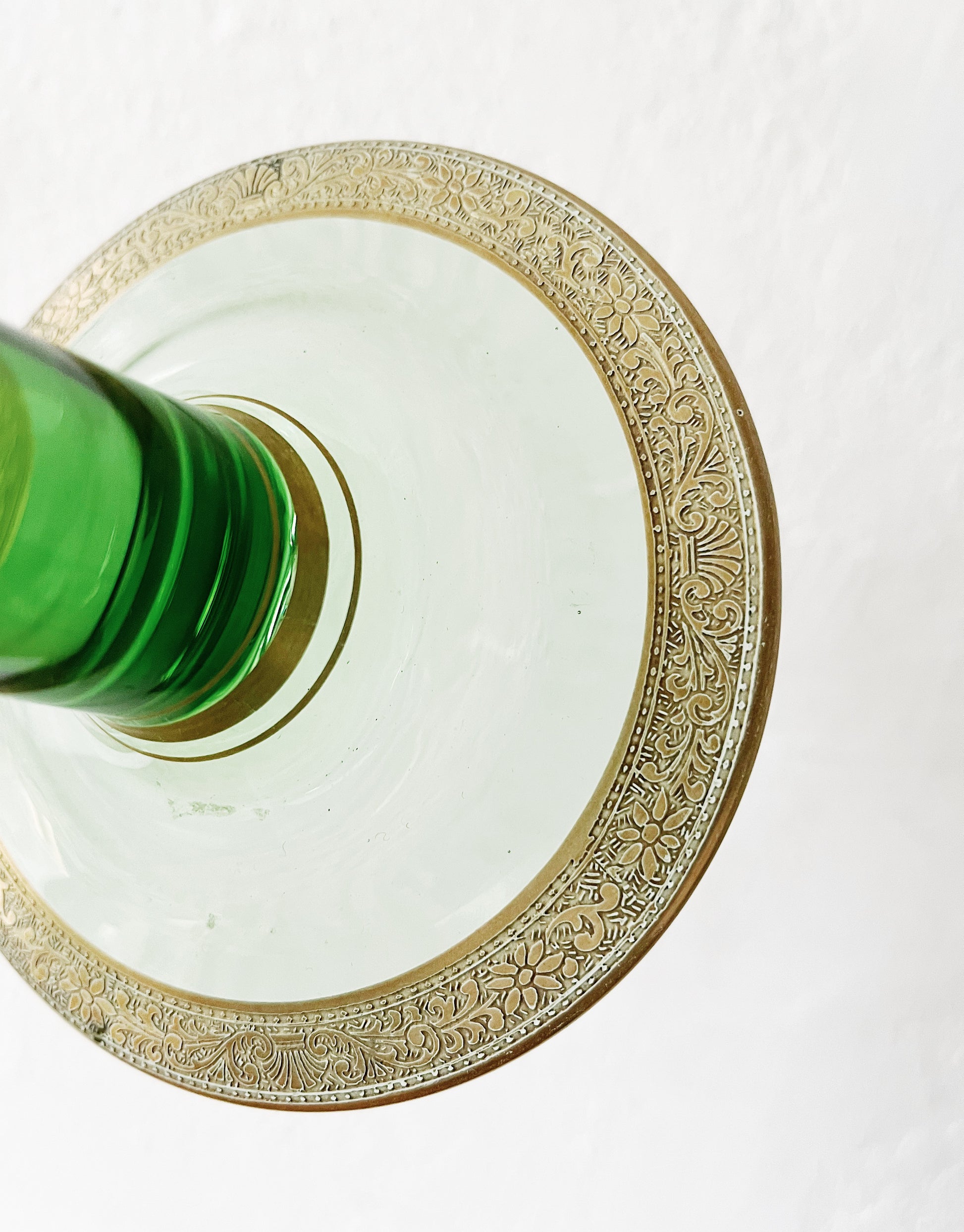 Really lovely watery green glass candlesticks with gold leaf detailing. So so pretty especially when illuminated.
