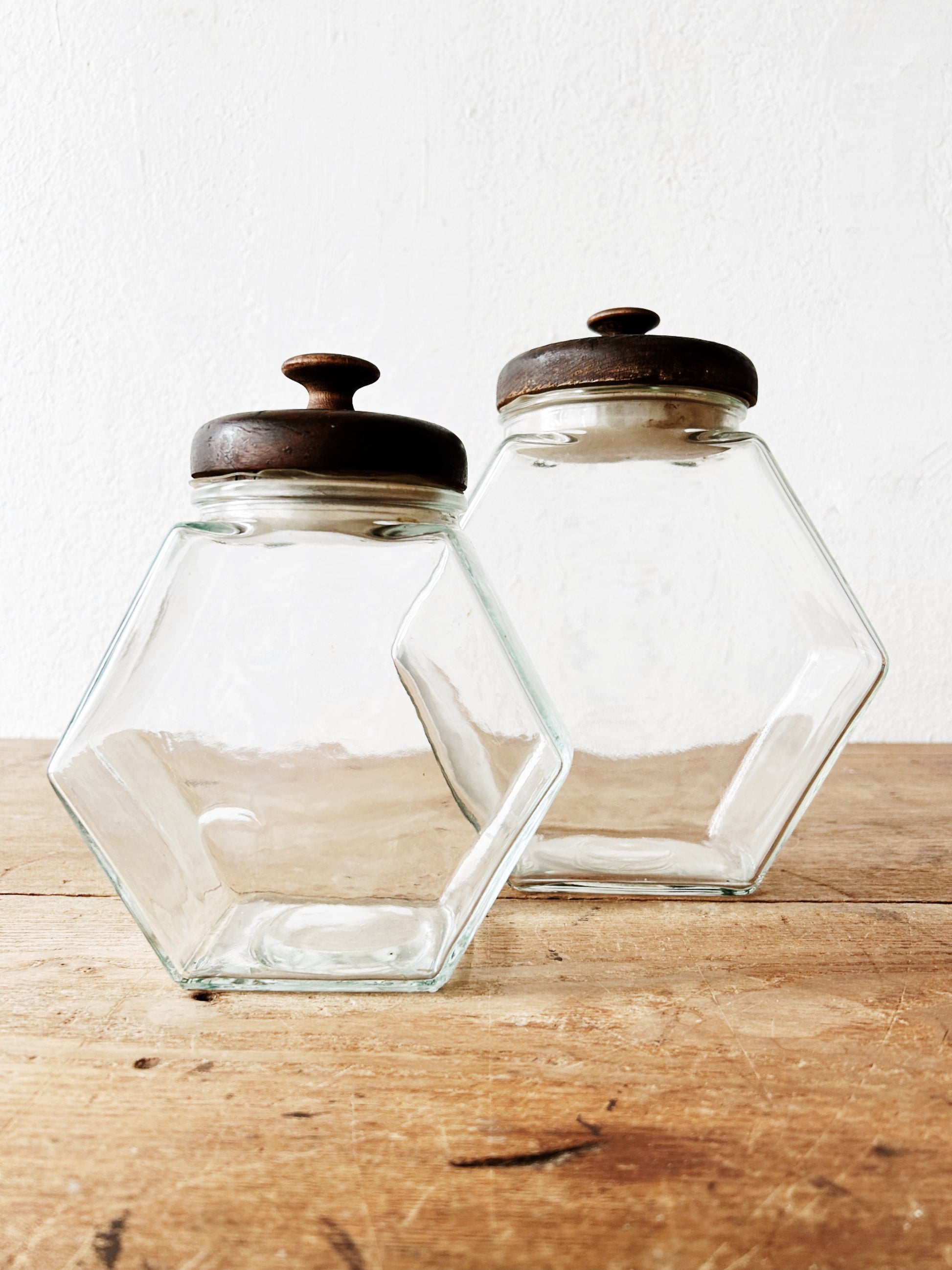 Love the shape of these chunky glass canisters. They’re weighty with wood lids. In nice condition, the lids show signs of age.