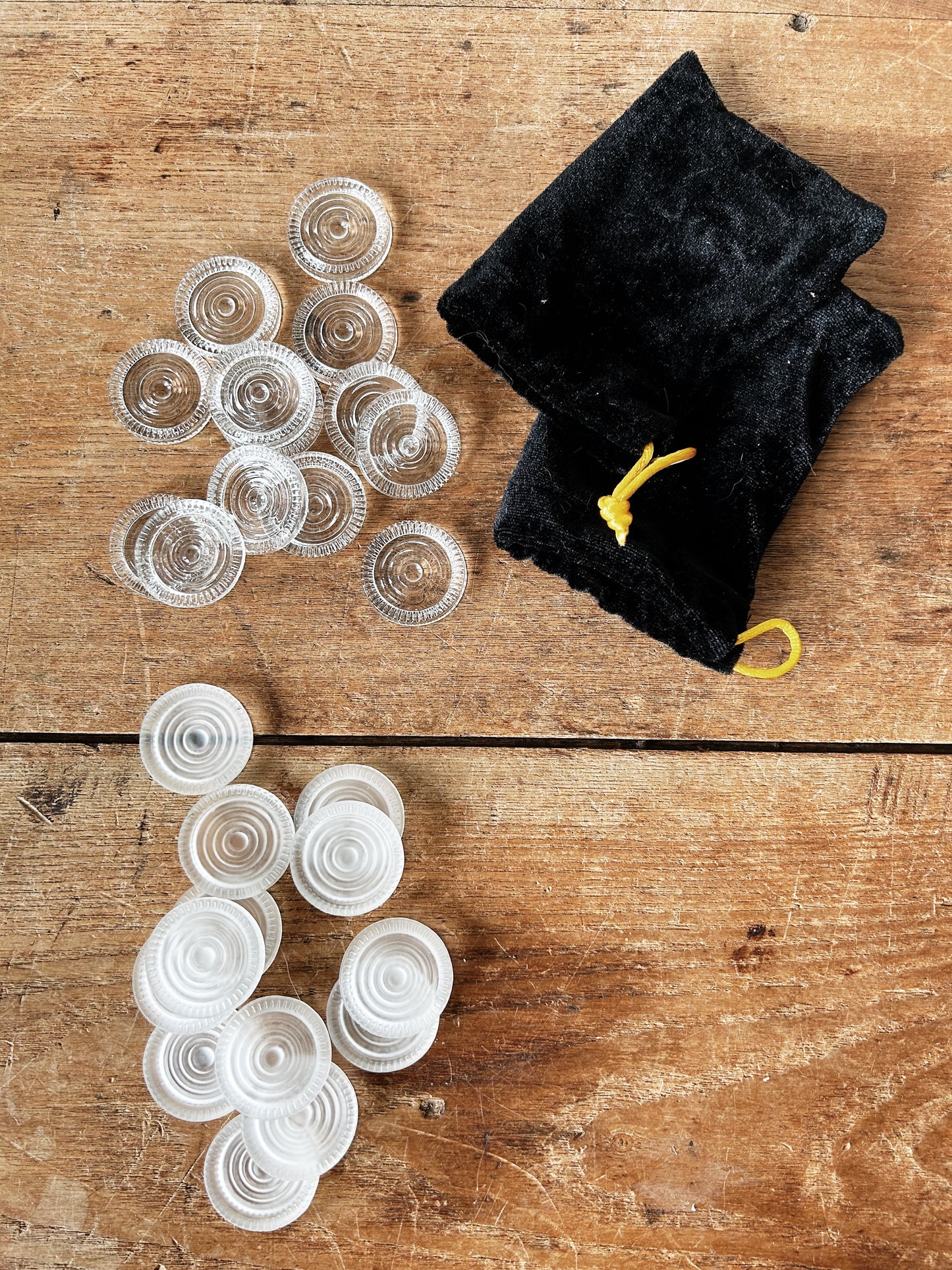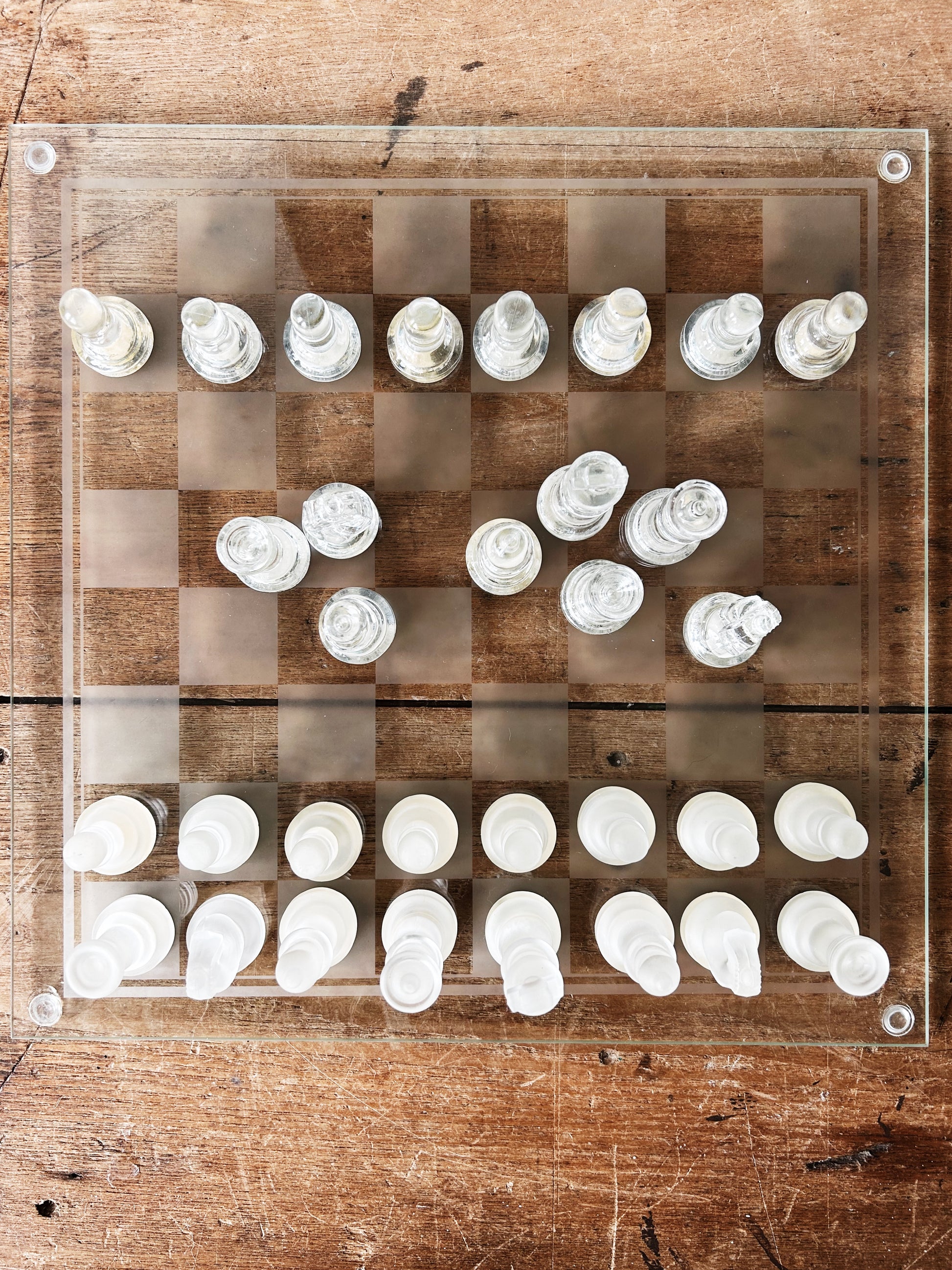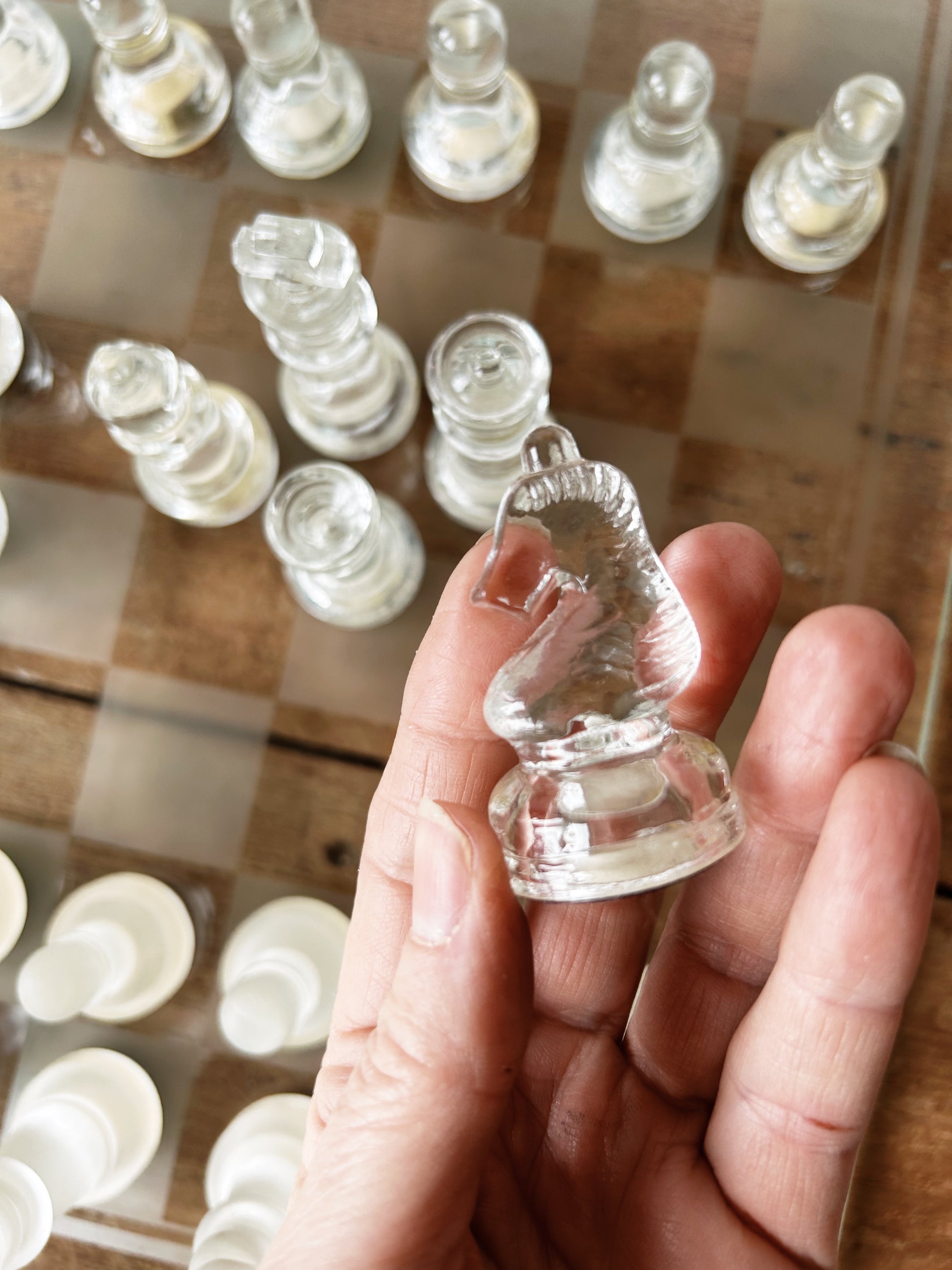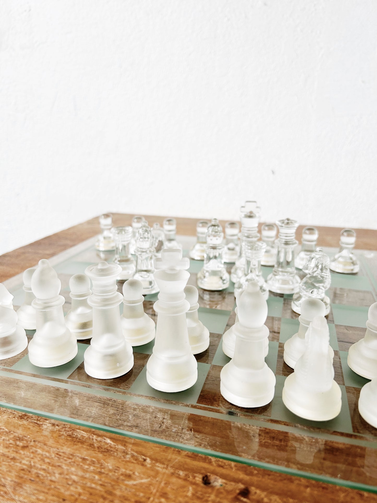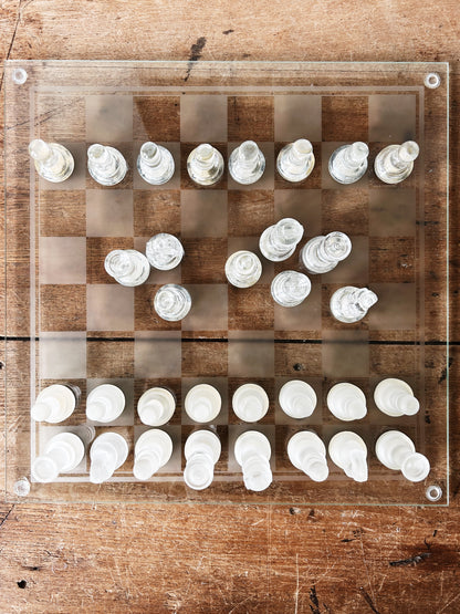 14x14” frosted game board, 32 chess pieces, 24 checkers.