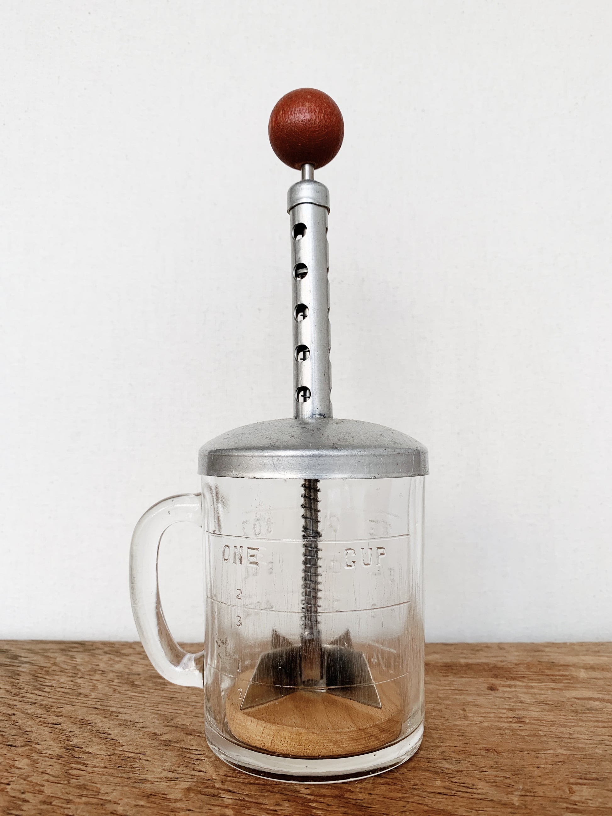 A nice old chopper. Thick glass with wood block and galvanized chopper with wood ball top. Very satisfying! And works great for chopping nuts, onions, ginger, etc. Measure marks on the dice, 14/ c - 1 c