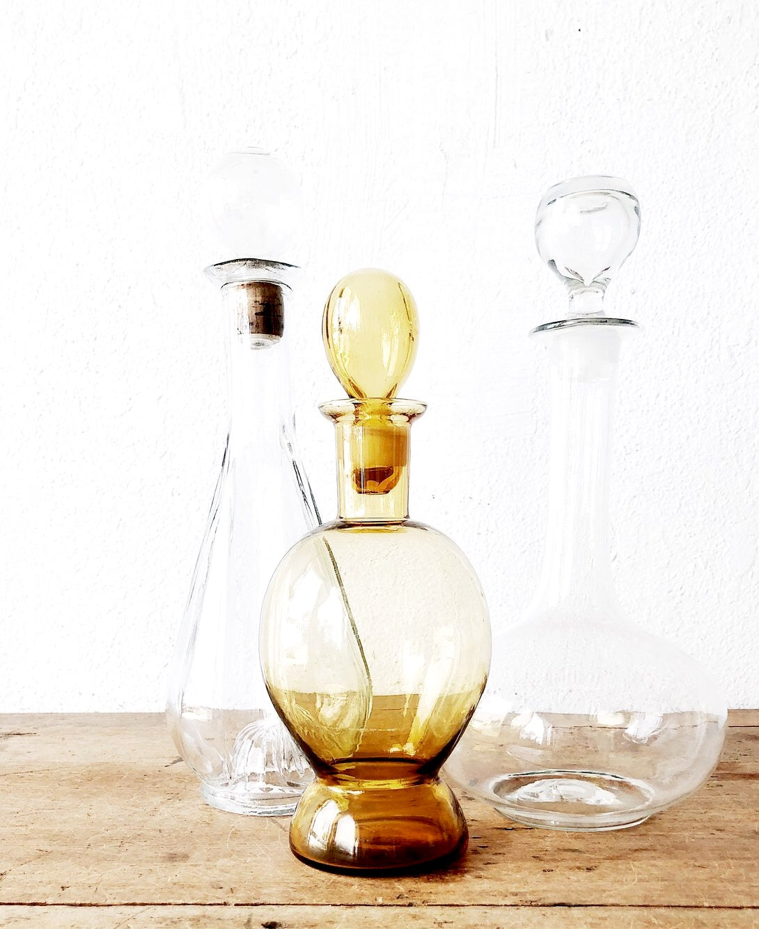 A set of beautiful mid century decanters. Two are clear with lovely shapes And the third is a golden colored glass. All have stoppers