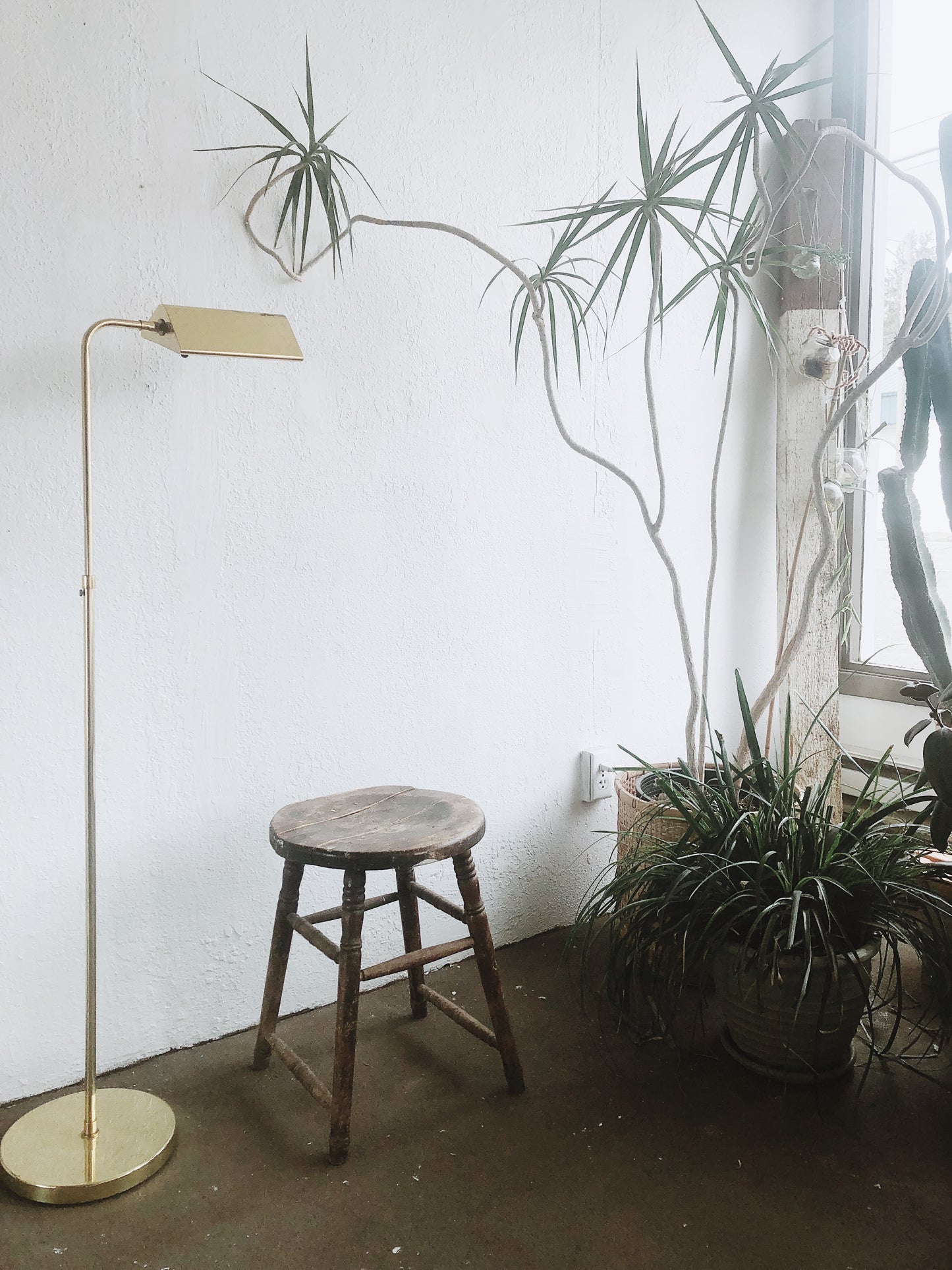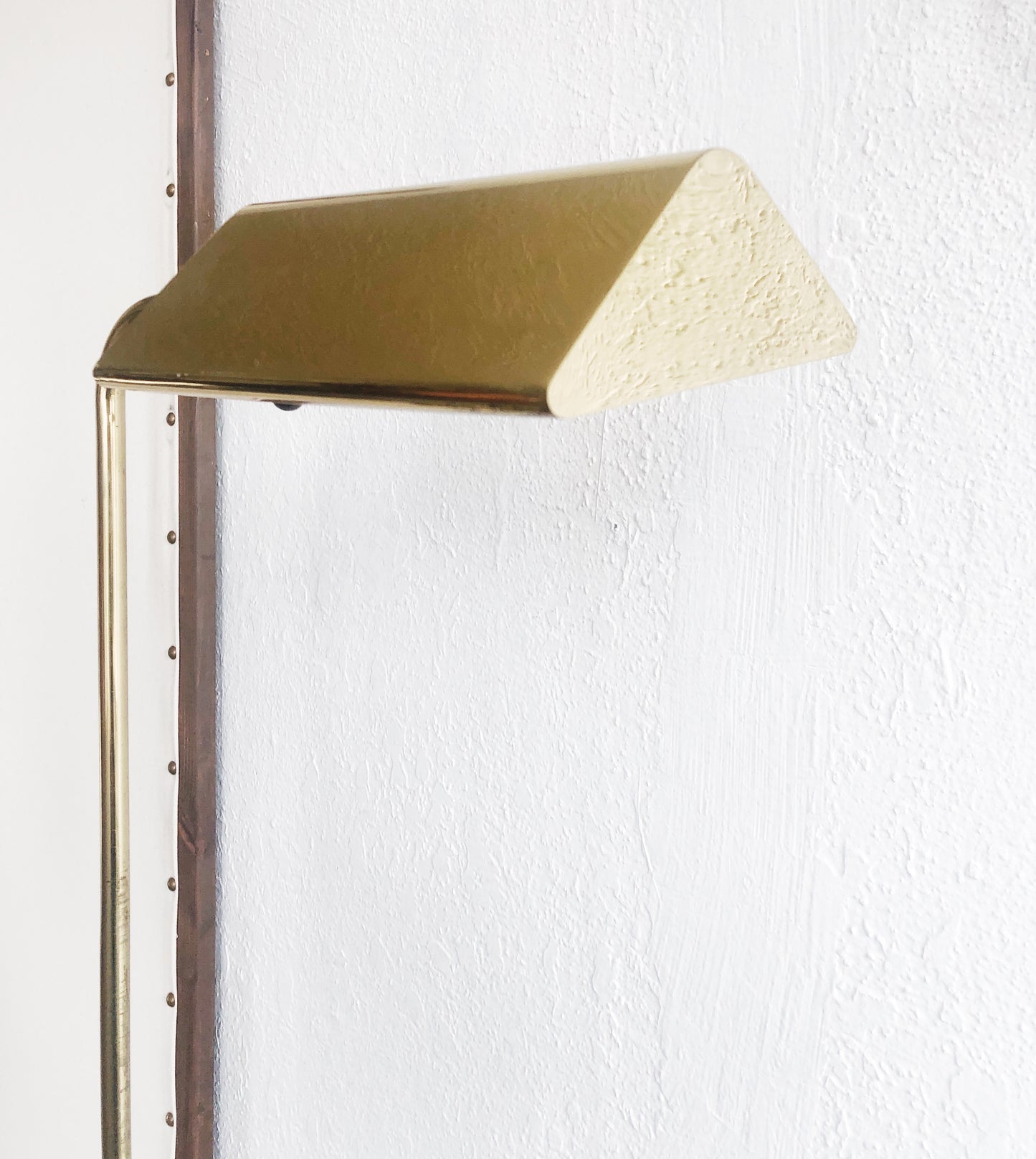 Swanky and slim gold tone metal floor lamp. Nice geometric shade. Adjustable height. Bronze ball on off switch.