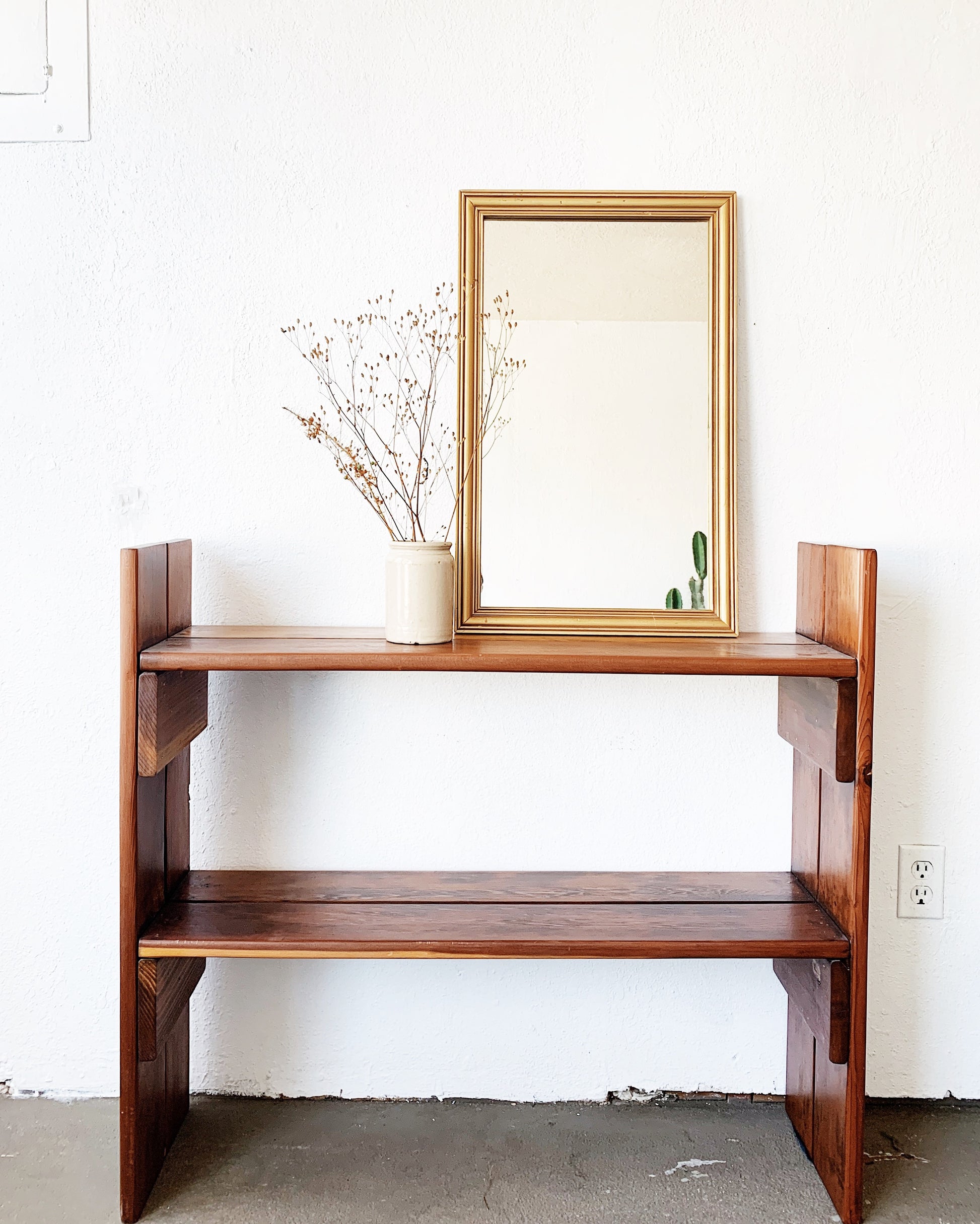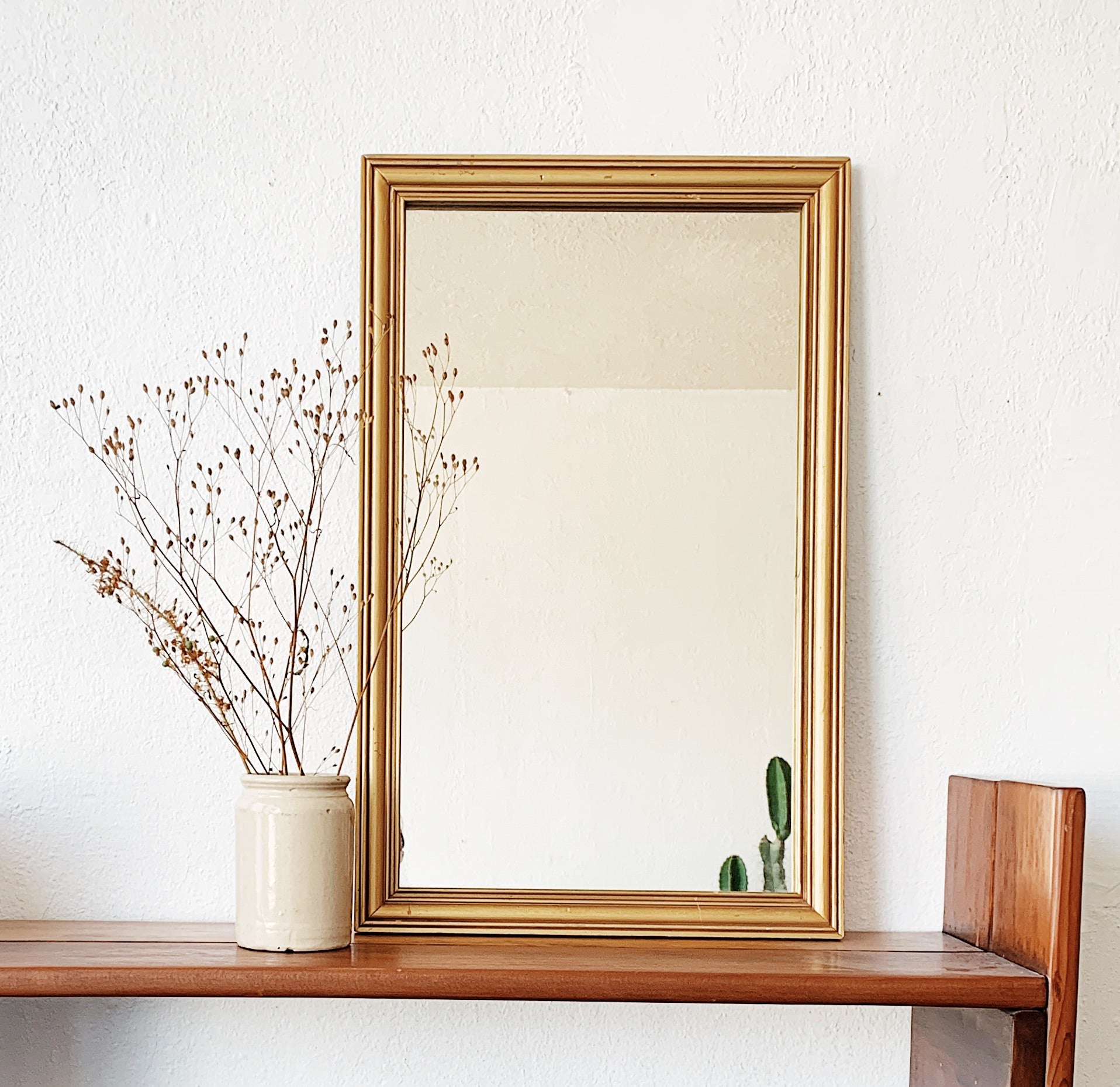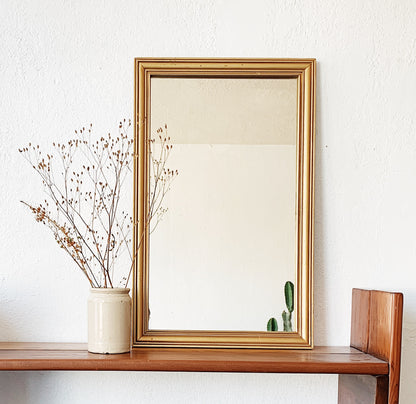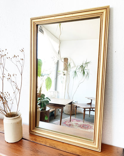 Vintage gold wood framed mirror in excellent condition. Simple and elegant! Weighty, with wire hanger back. Mirror is clear and in nice shape.