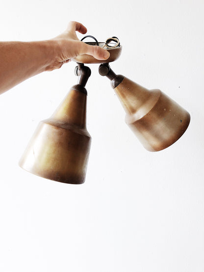 A 1970s ceiling fixture in gold and brass tone. Adjustable spots. Hardwire to ceiling or wall and use as a sconce