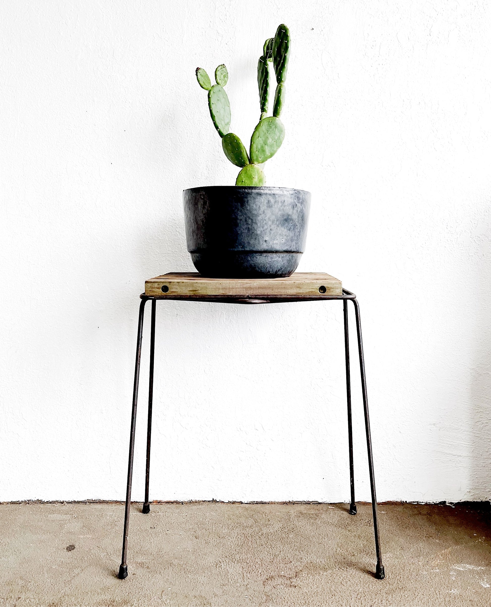 Skinny iron hairpin table from the mid century. Removable slatted wood top. Sturdy despite its fragile look. Nice plant stand